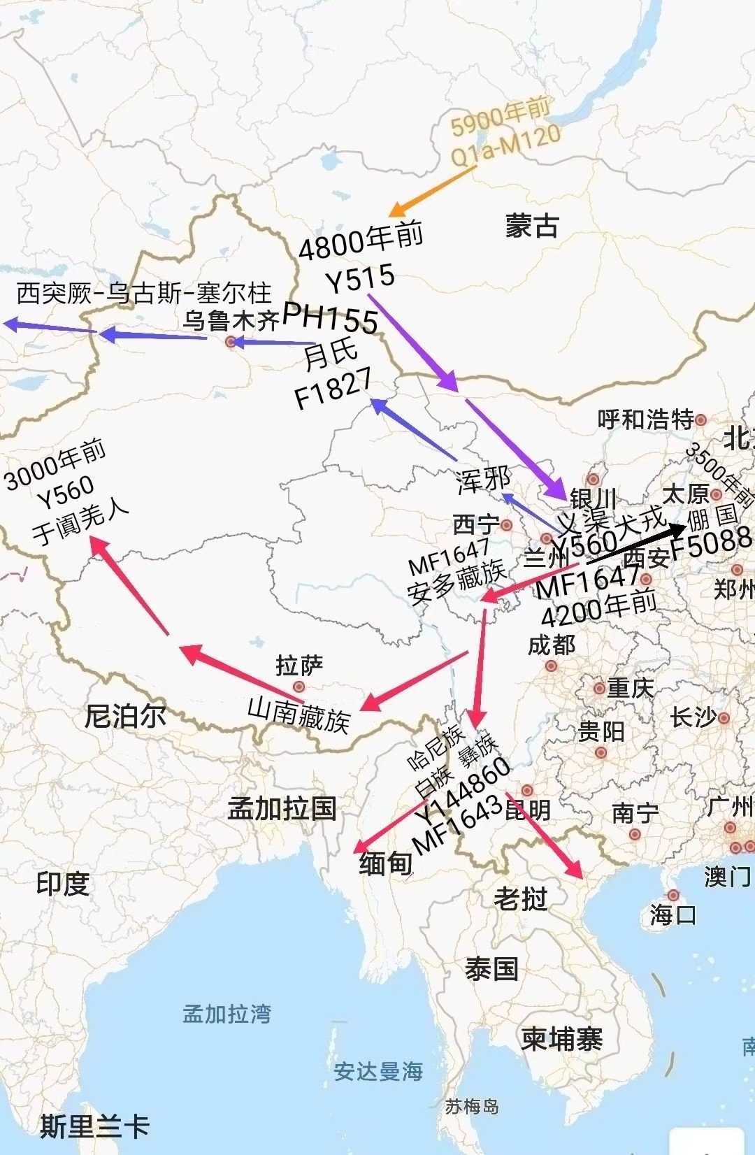 Q1a-F1626是叶尼塞流域人群,可能因为遭到R1b-Z2103阿凡纳谢沃人群的入侵,5000-4800年前南下阴山、河套、彭阳、庆阳、天水,融入马家窑文化人群,语言也从原来的叶尼塞语同化为藏缅语。