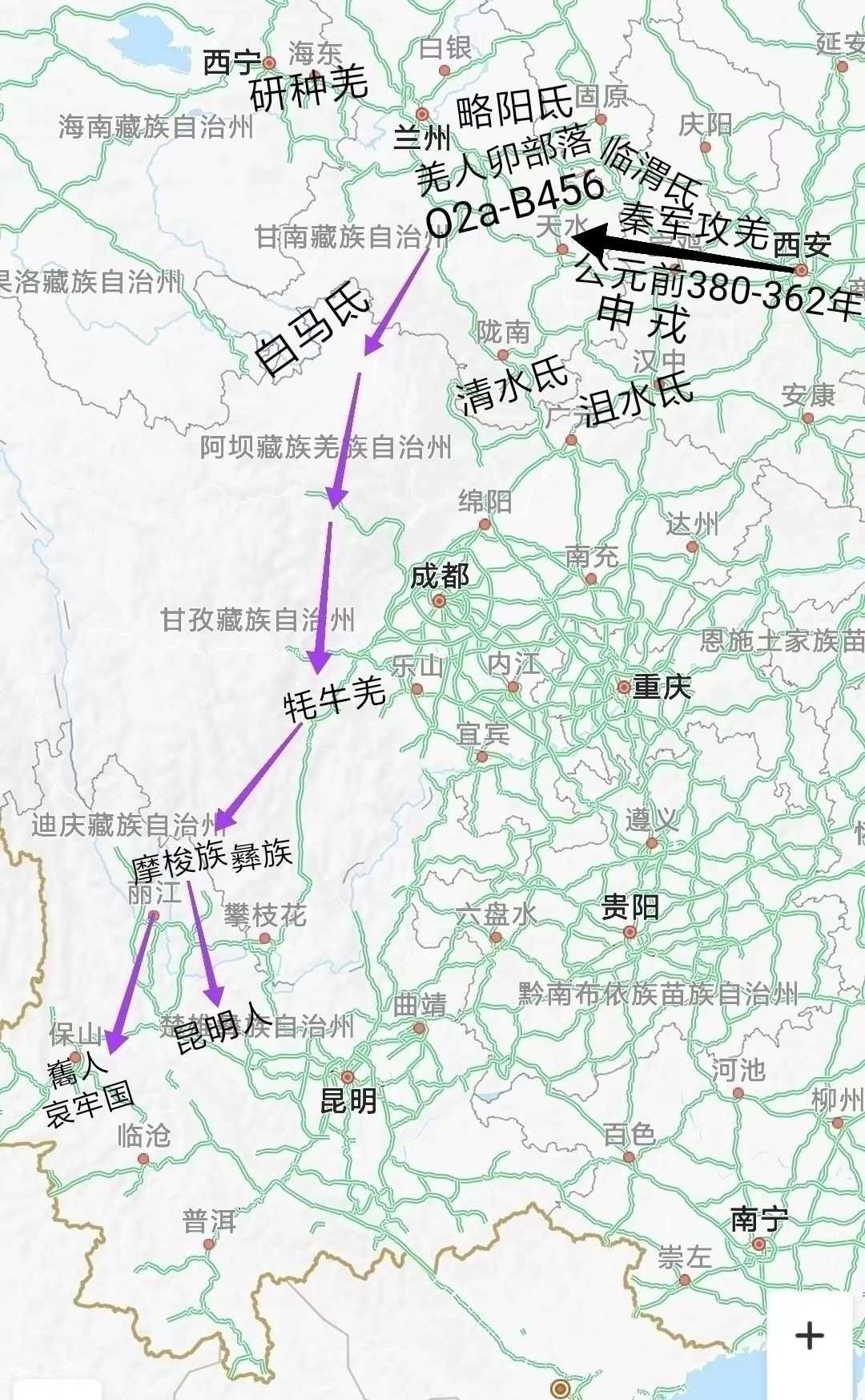 南下川西、滇西北的O2a-B456和D1a-F1031形成牦牛羌、越雟羌、昆明羌,后来形成纳西族、凉山彝族、楚雄彝族等。