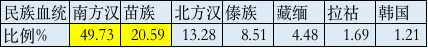 可以看到苗族群体的民族血统成分中,前三位的成分分别为近乎一半比例的南方汉族成分;五分之一以上的苗族成分和近乎八分之一的北方汉族成分,其构成情况与苗族所处的地理位置高度吻合。