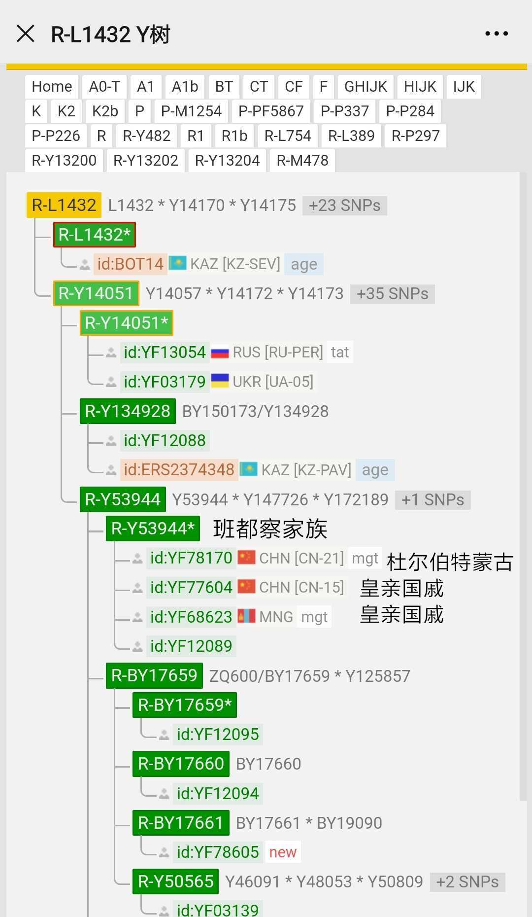 苏赫巴托尔塔班托勒盖墓地出土四例13世纪蒙古帝国皇亲国戚L1432,班都察、土土哈家族成员,这支皇亲国戚古样本没上树,倒有两个后裔高通上树。另有一个杜尔伯特部蒙古族,可能来自燕铁木尔一系。