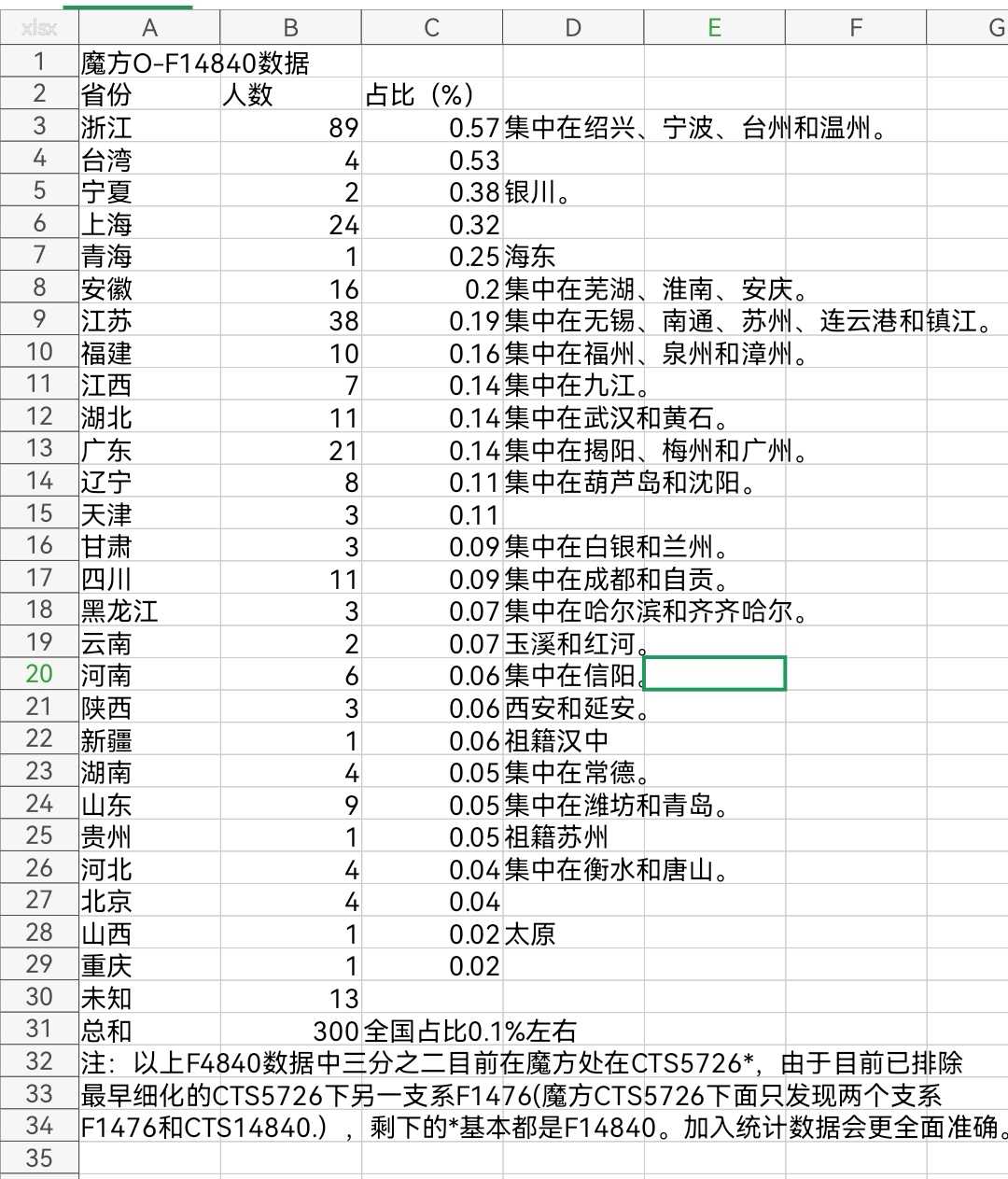 为什么会认为F14840支系是越王系,首先因为绍兴大禹陵守陵人禹陵村姒姓测出是O-M119-CTS5726-F14840-MF63114支系。而他们记载了4000多年历史的《姒氏世谱》里绍兴守陵人姒姓是西汉时期东瓯王摇的大儿子的后代。先回顾下文史记载的越国的历史,《史记》记载越王的祖先是夏王少康的庶子无余为守护绍兴大禹陵而封在会稽山的,后代因失德而失去封地。大概到了2700年前的无余的后裔无壬时期,重新恢复对大禹陵的祭祀并得到人民的认可而建立了越国,成为首任越王。越国以绍兴-宁波一带的宁绍平原为根据地与北边的吴国展开了长期的对峙和战争,公元前473年越王勾践灭吴,会盟诸侯于徐州,称霸天下,迁都琅琊(一说在山东青岛,另一说在江苏连云港)。公元前313年越王无疆攻楚失败被杀,公元前303年楚国灭越,越国贵族退回浙江。琅琊作为越国首都将近2百年,其后越王后代诸君退守在宁绍平原,闽越有无疆的直系后代无诸占据,东瓯由另一只越王后代摇占据。到了西汉越国诸君由于佐刘邦灭项羽有功,功劳最大的无诸封闽越王,摇封东瓯王。大概传了7-8代王到了汉武帝时期,闽越和东瓯爆发了战争,东瓯王抵挡不住,请求西汉政府改封到其他地区,于是改封彭泽王,举国几万人前往江西彭泽(今江西九江湖口县一带)。东瓯地区划入闽越国的境内,紧接着爆发了闽越国造反事件,西汉派大军压境,闽越国内内乱杀闽越王投降。为防闽越国再造反,西汉政府又把闽越国十几万人分散迁到河南、江苏、湖北和安徽的江淮地区。魔方目前F14840共祖时间2680年,下面仅细化了两个支系MF38173和MF63114,其他大量在宁波和台州仍处在F14840*。其中MF38173共祖时间2370年,MF63114共祖时间1800年。由于F14840高通数量少,目前的估龄的准确度应该不是很够。目前已细化的几例MF38173分布在温州、宁波、湖州、衡水、葫芦岛、阜新、武汉、北京、揭西、广州等地,共祖时间和地域分布与闽越王系大体吻合。已细化的几例MF63114分布在绍兴、九江、漳州、泉州、成都和台湾等地,共祖时间和地域分布基本与东瓯王系吻合。而大量处在宁波和台州等地的F14840*与记载中的越国诸君地域吻合,以后细化后会更清晰。目前魔方F14840共祖时间和地域分布上与越王系的历史活动是高度重合的,而且还有为大禹陵守陵4000年的姒姓及其《姒氏世谱》为证,是越王系可能性极大,待以后F14840支系进一步细化后应该会越来越清晰。