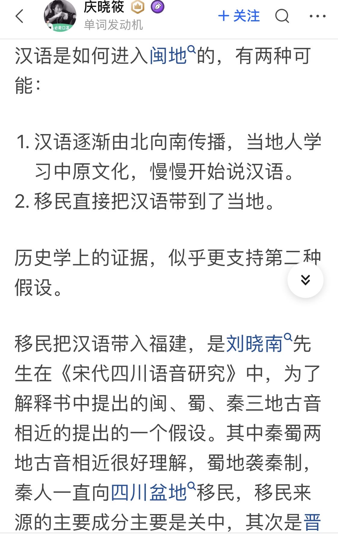 正如上面兄台说的,闽语一和蜀同音,汉朝当时的一也和蜀同音,而南楚读当时的獨这个音,说明闽语不是来自楚语,而且与汉时长安附近的话相近,那么闽语就是直接来自秦晋之地的。