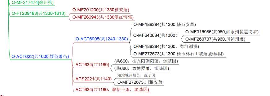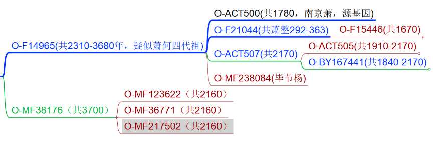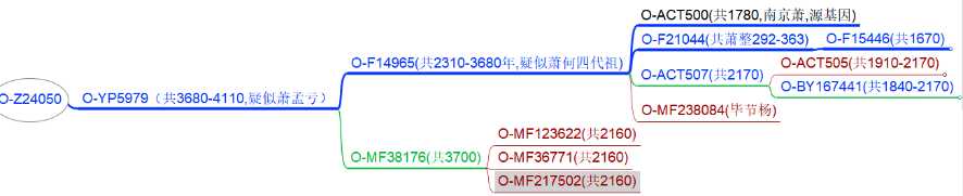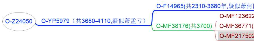 O-F1252→O-F2924→O-F2524→O-M111→O-F2890(此处出现好几个萧氏下游)-O-Z24048(共祖5030年)→O-Z24050(魔方以前免费检测的数据,萧氏数据就在这一层)→