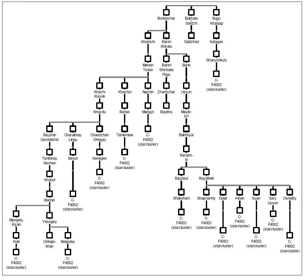 更细的划分是,原属于察合台汗国四大千户之一的Dulat(杜拉特千户),高达58%的个体属于星簇,具体C2-Y4541的下游为C-Y4541-F12782。