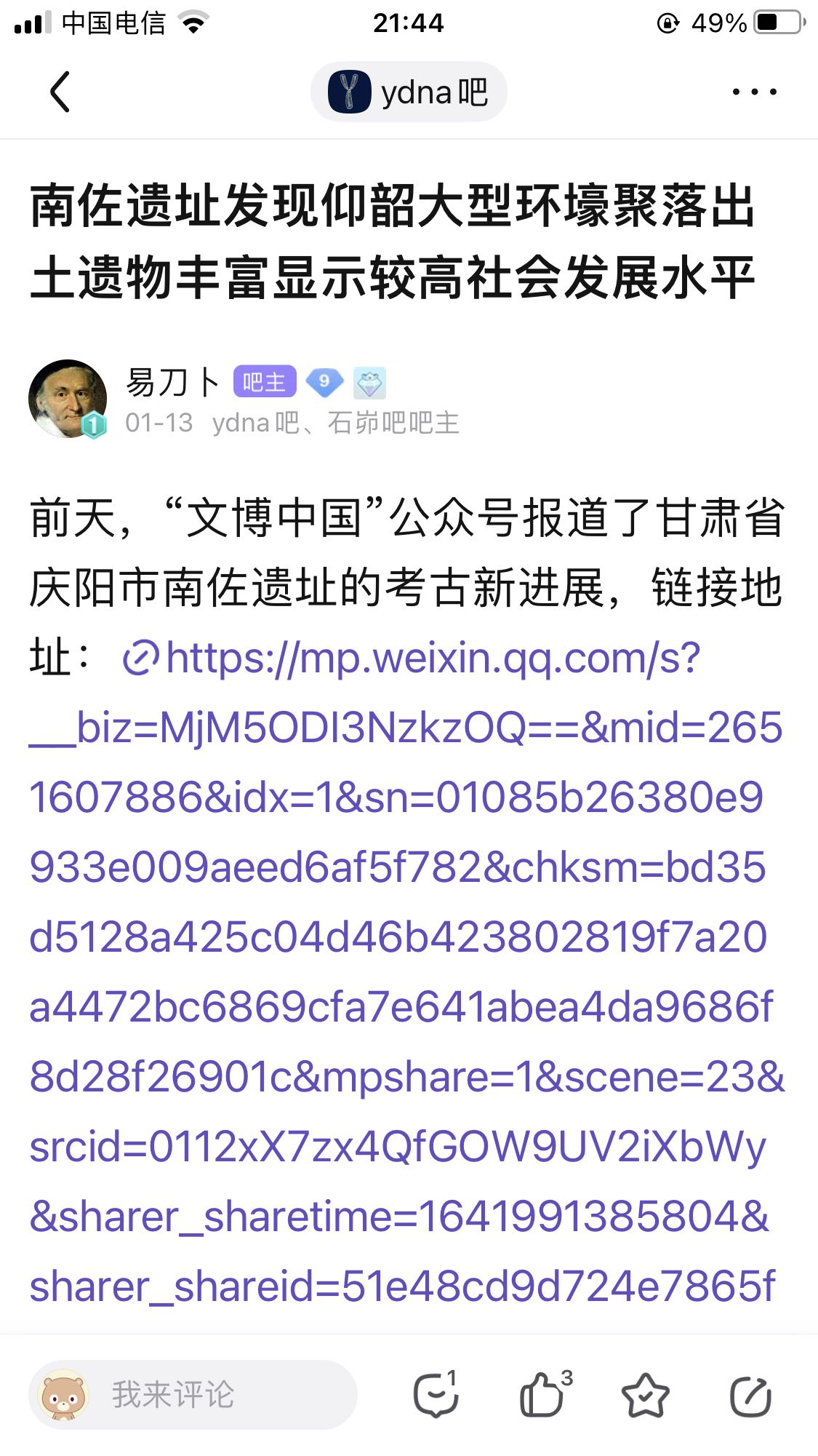 引用贴吧大神的帖子--前天,“文博中国”公众号报道了甘肃省庆阳市南佐遗址的考古新进展,链接地址:https://mp.weixin.qq.com/s?__biz=MjM5ODI3NzkzOQ==&mid=2651607886&idx=1&sn=01085b26380e9933e009aeed6af5f782&chksm=bd35d5128a425c04d46b423802819f7a20a4472bc6869cfa7e641abea4da9686f8d28f26901c&mpshare=1&scene=23&srcid=0112xX7zx4QfGOW9UV2iXbWy&sharer_sharetime=1641991385804&sharer_shareid=51e48cd9d724e7865f8d03fbaa463a92#rd。