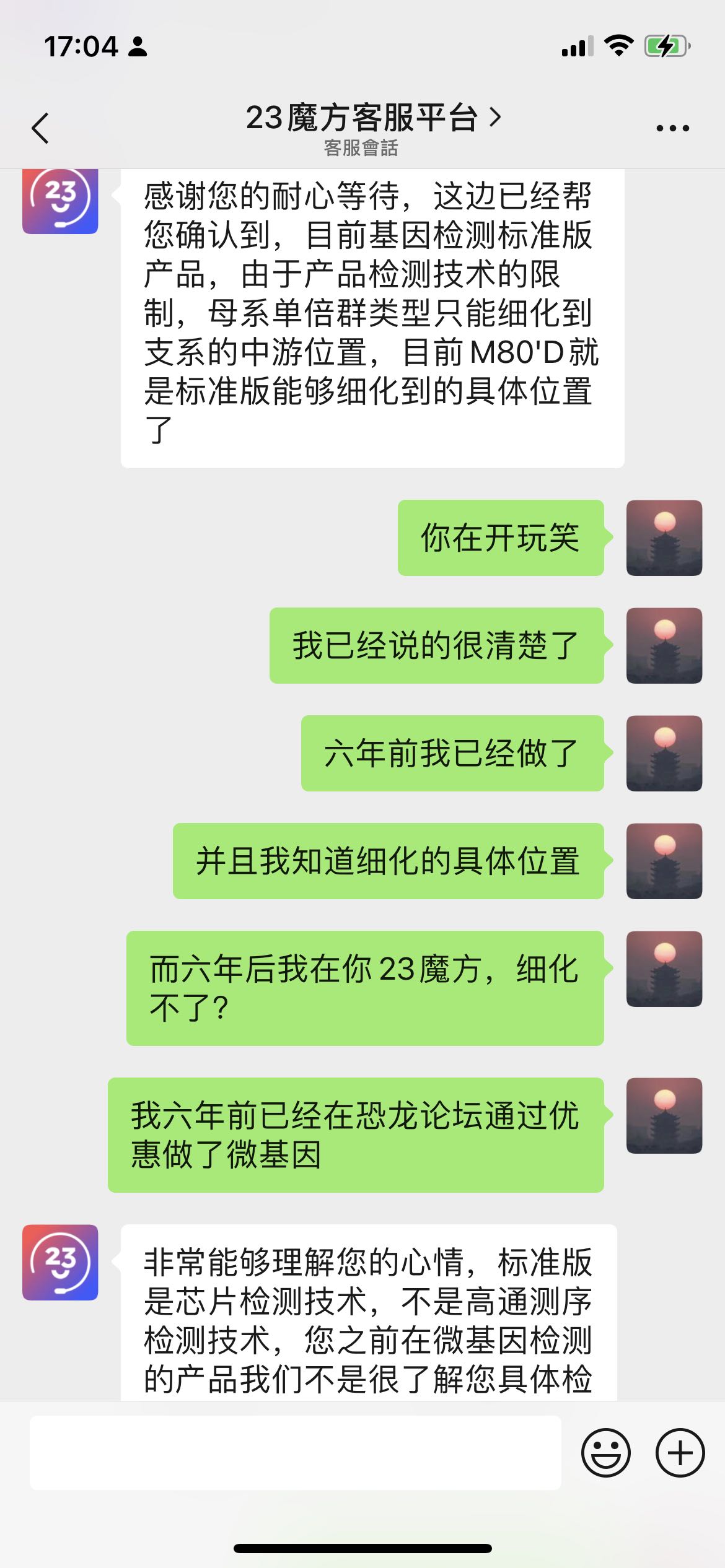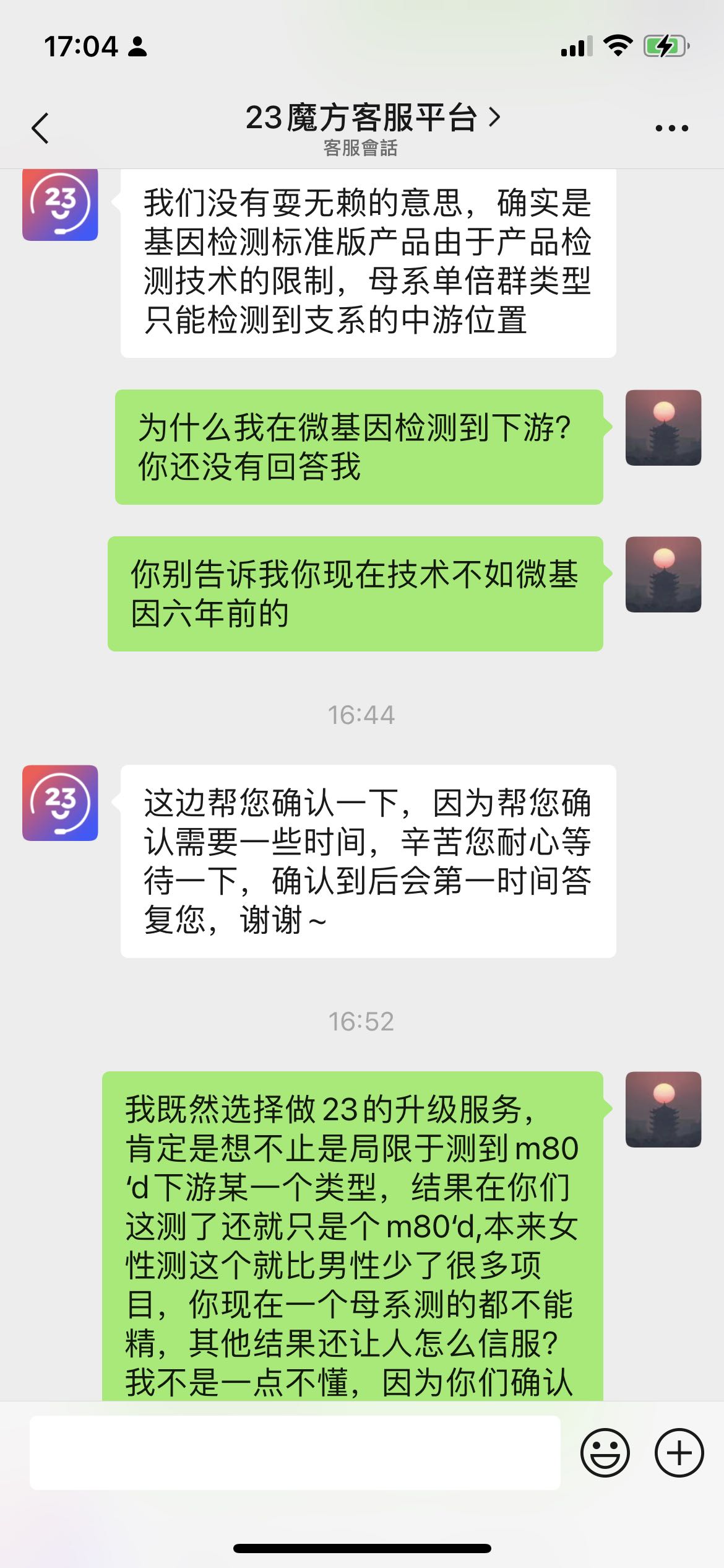 我(我是女生)六年前在微基因做了第一代标准检测,当时检测母系类型是D某类型,前年做了23魔方免费体验版,但看不到母系类型,今天看到升级健康+祖源只要199,我就升级了,结果看到母系类型是m80'd,无法细分,难道魔方现在检测技术还不如微基因六年前吗?魔方给到我的答复是它们是侧重做父系,我是女性,如果我在检测之前我知道母系检测精细度还不如微基因六年前,我还会去测吗?