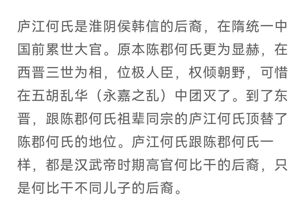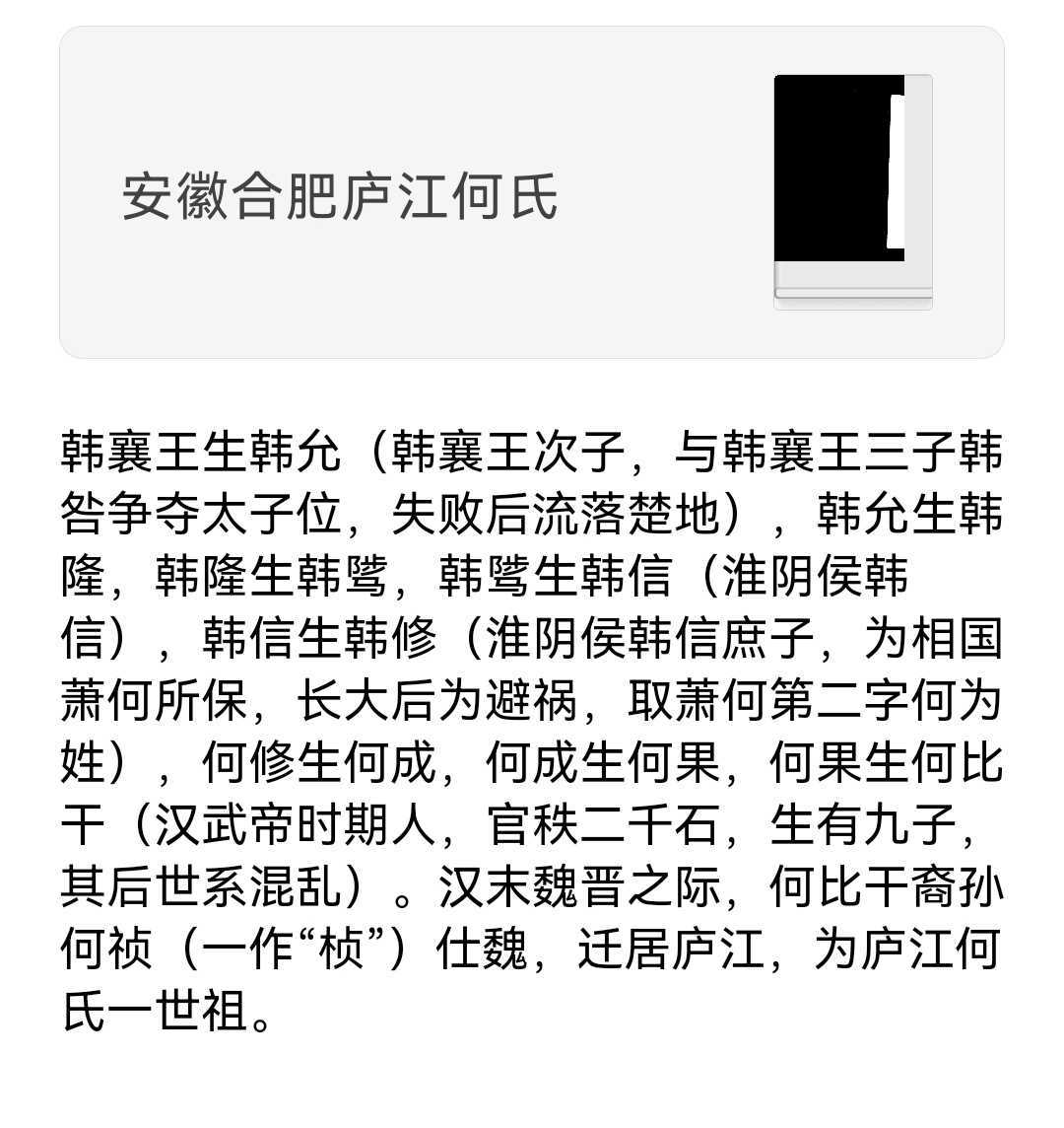 庐江何氏由于是淮阴侯韩信的后代,在汉朝为了避祸对族谱进行了掩饰,有人把族谱往上推几代,把得姓始祖说成何允(韩允),同时把韩允误传成韩王安次子,韩允实际上是韩襄王次子。为了避祸,有人把淮阴侯韩信说成是写《韩非子》的韩非(被李斯害死在秦国大狱,无后),也有人把淮阴侯韩信说成是汉文帝时期河东太守韩信,河东太守韩信是故意捏造的历史人物无疑。淮阴侯韩信的庶子韩修被部分族谱说成是韩庶,应该是淮阴侯韩信庶子的缘故,后世以讹传讹。广东那一带何姓是宋朝逃难到广东的难民,丢失了族谱,不知道先祖来历,在清初伪造了族谱,把得姓始祖说成韩瑊,历史上根本不存在这个人。