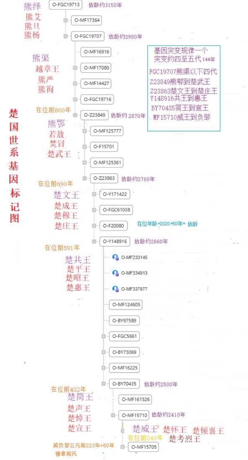 不要说那张楚王世系图是根据临沂日照分布倒推出来的,O-FGC19707各支系高通率很高,临沂支和日照郑氏高通的样本偏偏很少,说明O-FGC19707族人在推测楚王世系时根本没注意到这点。O-FGC19707在临沂日照的高频及时间节点、树枝位置与早期推测吻合得非常好,O-FGC19707与后期楚王的相关性也得到了一定程度的佐证。 O-F793为楚论和绿楚论越来越站不住脚了。