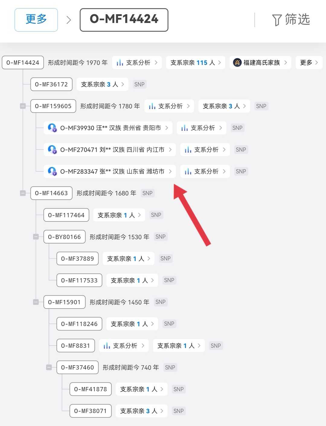 O-FGC19707临沂支姓氏多种多样,这几例日照郑氏只有两人是同一人代管的,说明二者具有统计学意义。 再换个角度看一看,画箭头的分别是是临沂支和日照郑氏唯一的高通样本,都是在根部。