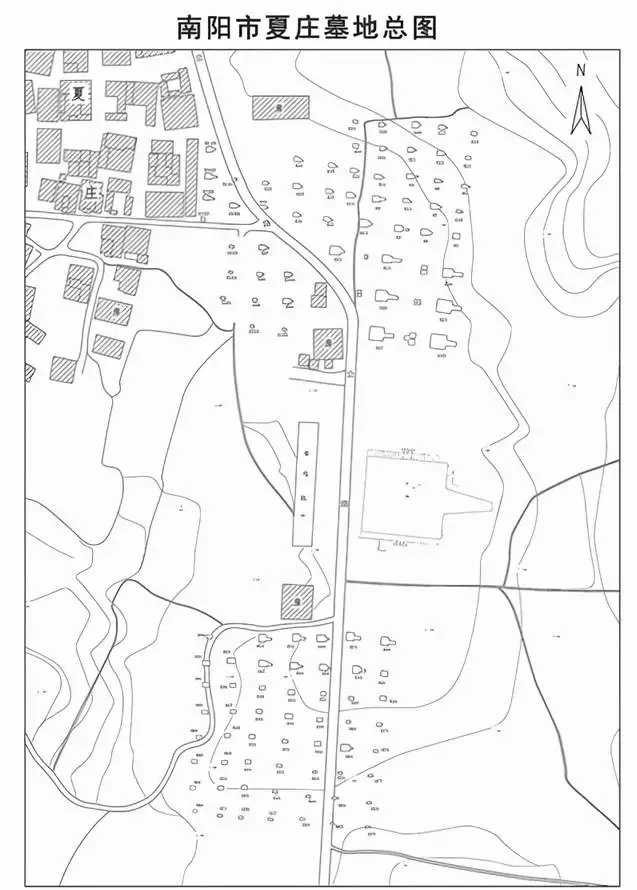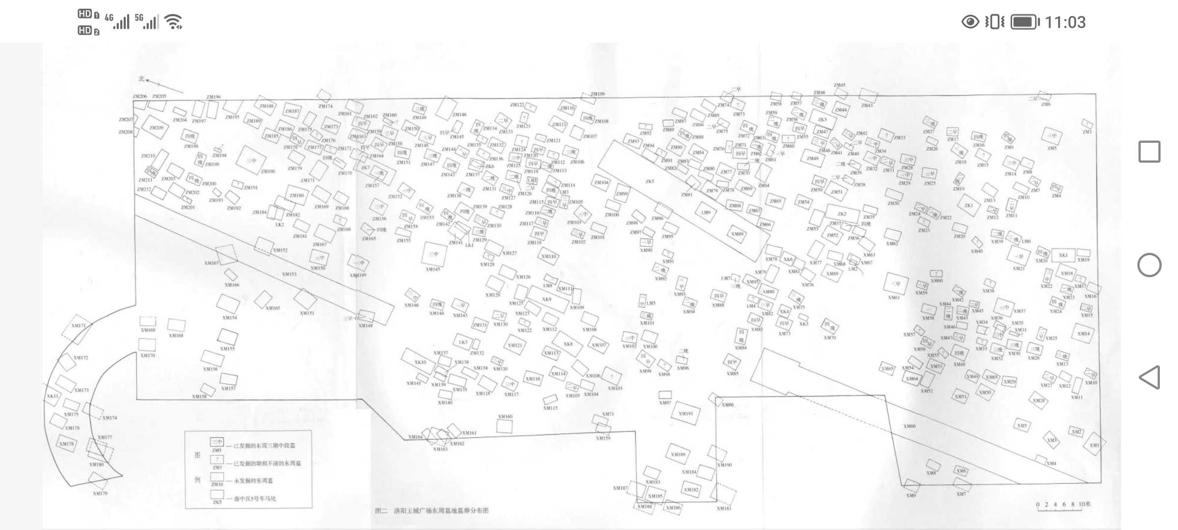 2.洛阳春秋周天子陵(XM153、XM66)及天子驾六车马坑(ZK5)和周围的陪葬墓(注意看左上角的方向箭头为北向,墓葬方向大多数和箭头一致为北向)