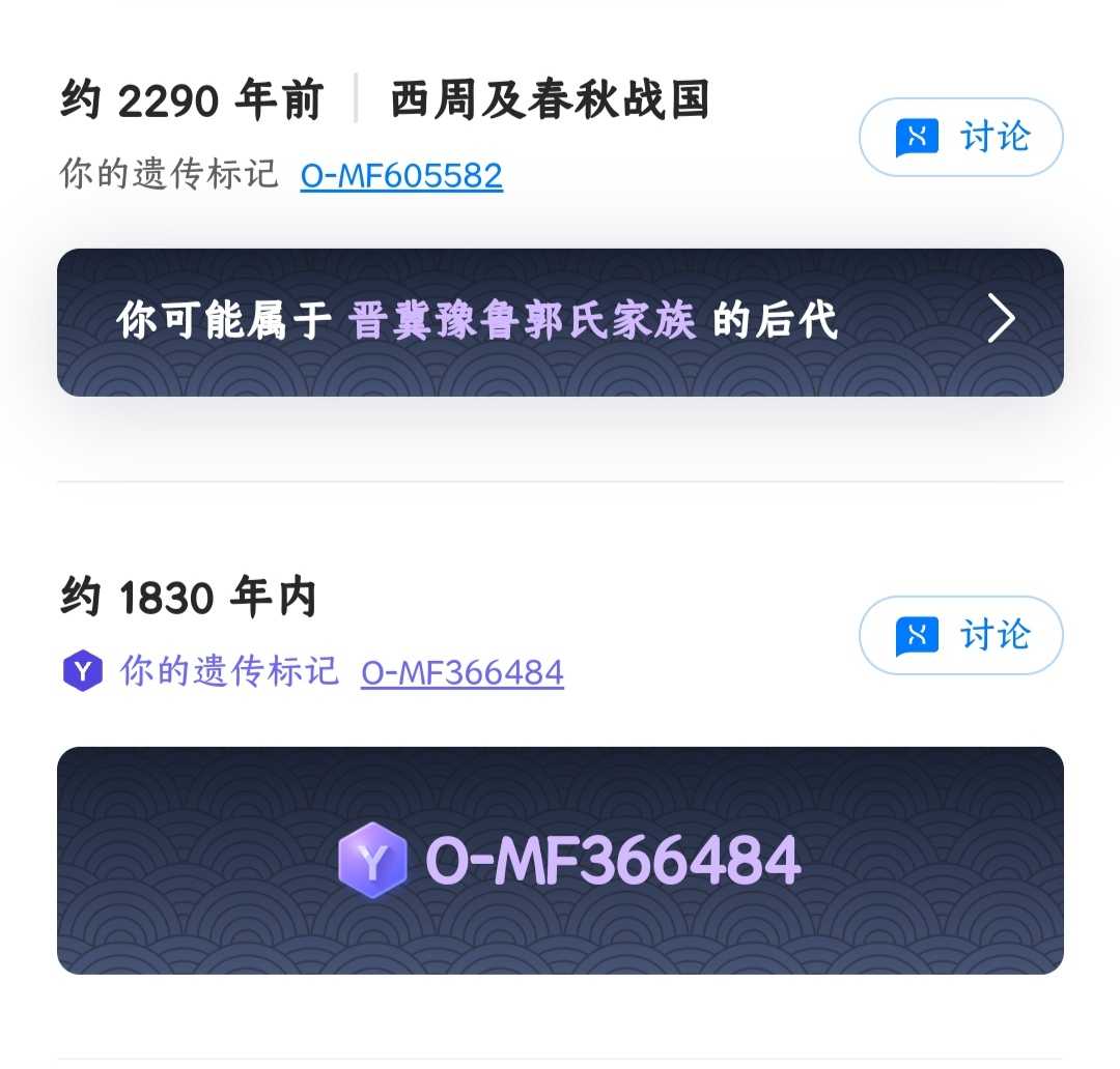 这种其实就当开拓者了。你有共祖2000年内的宗亲,还算好了。我共祖2800年,好几年了,新出的都是这个时间点或者更早的。其实最好还是动员下大家族去高通,把自己家族的树形弄出来,这样个人测会很容易匹配到近的同宗。