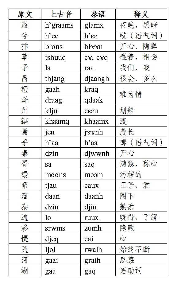 现在对于百越的语言研究一般认为与南岛语系和侗台语系有关,好多研究都试图用这两种语系去翻译越人歌。郑张尚芳就从泰语试着翻译了越人歌,如图。
