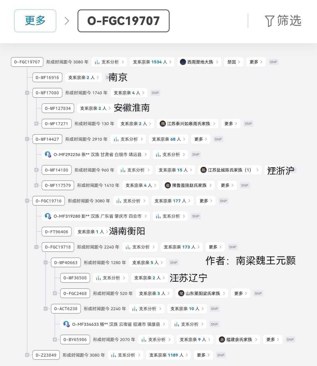可以看出,O-FGC19707虽然人口集中于福建,但从分支的数量上来说,福建并不突出。O-FGC19707的每一层基本都有不少湖北、重庆、山东、江苏的样本,只不过到福建的基本上都爆成了大簇,鄂渝鲁苏分支的人口却都不兴旺,甚至住了单间。所以O-FGC19707极有可能是个湖北家族。 O-FGC19707只有两个屈,一个在湖南邵阳,另一个在广州,疑似屈大均后裔。O-Z23849-MF125361的这个屈是邵阳屈,另外一个挂在Z23849。如果秭归屈氏能验证基本上就实锤了。距离秭归大概两三个县的奉节屈有测出O-F793,但地缘相近同姓不同Y的情况太多了,秭归屈氏还是应该测一测。