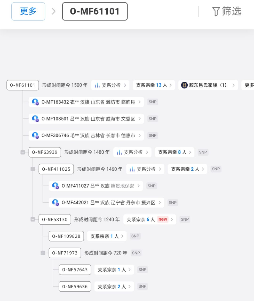 胶东吕氏虽然目前只有十三人,但是高通人数有五人。所以根据比例估算这是个百人以上家族,因为胶东地区历史上相对稳定所以出现百人以上大族机率很高。但是目前不确定的是如果有新的高通用户对树形影响多大?