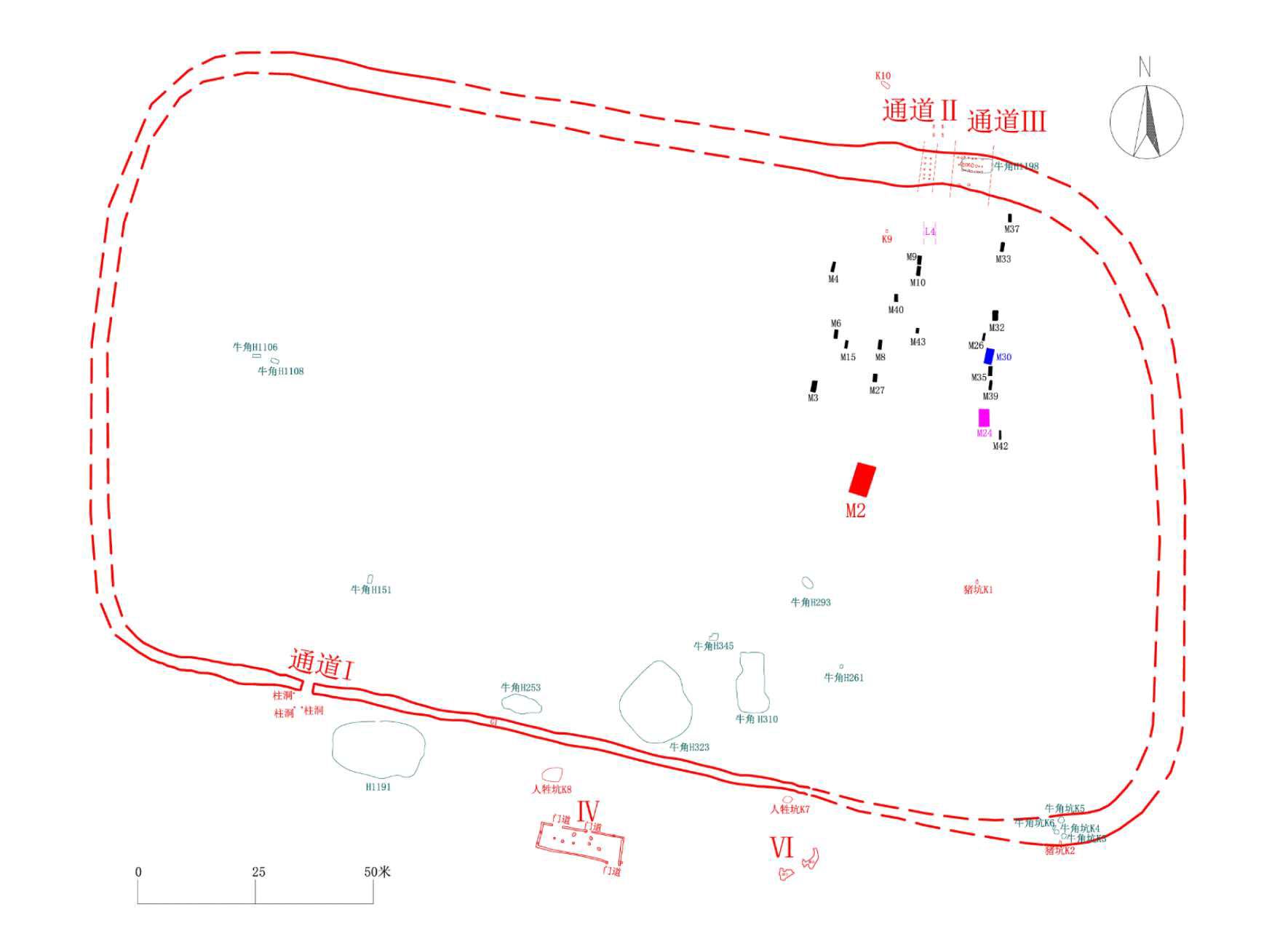 兆域内发现了人牲、猪牲、狗牲以及密集的牛角坑等多类祭祀遗存。这点可以对应殷墟西北岗王陵,所以王族墓葬色彩很大。