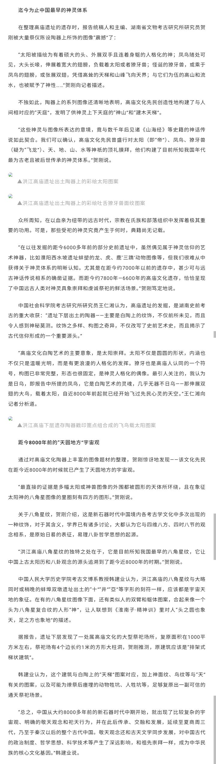 有专家认为红山晚期受江淮影响,促进古国的形成和发展。高庙文化影响深远,中国最早的神话体系,太阳鸟崇拜,八角星纹,天圆地方的概念,良渚的神徽(祥见邓淑萍老师的神祖灵纹研究)源头都可以追溯到高庙文化。这些元素的传播路径很可能是先从长江中下游北上到江淮再通过大汶口和仰韶传入辽河,和大祭司双龟老人一样,这座红山最高级别大墓的统治者很可能祖先是来自南方,所以还保留自身的图腾习俗。