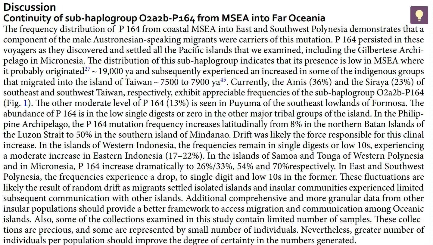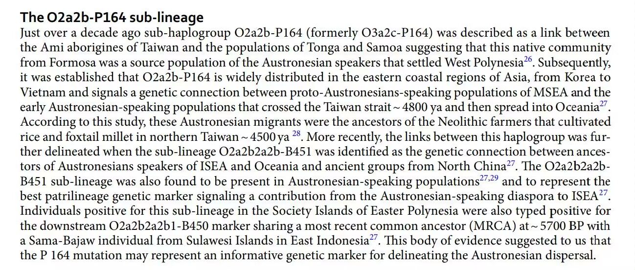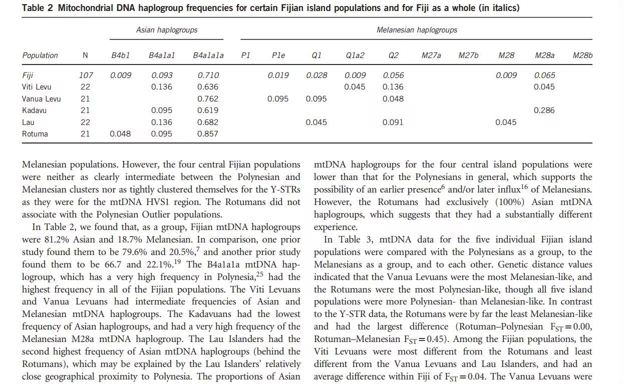 斐济母系高达80%多是南岛B4a1a,父系根据另一篇论文和FTDNA只有13%是O。Genetic structure among Fijian island populations指出这种父系来自巴布亚、美拉尼西亚,母系来自亚洲南岛人的情况在波利尼西亚是普遍现象,由此可知南岛O系迁徙到大洋洲的时候被巴布亚C1b2、M、S父系替换。