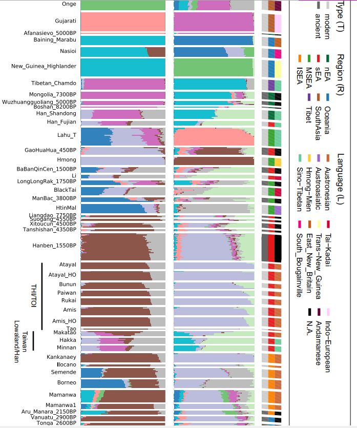 注意观察图中的“THI””Hanben”“Liangdao”等东南土著族群,成分为淡紫色,和成分浅绿+蓝绿的现代福建、浙江、台湾差异很大。