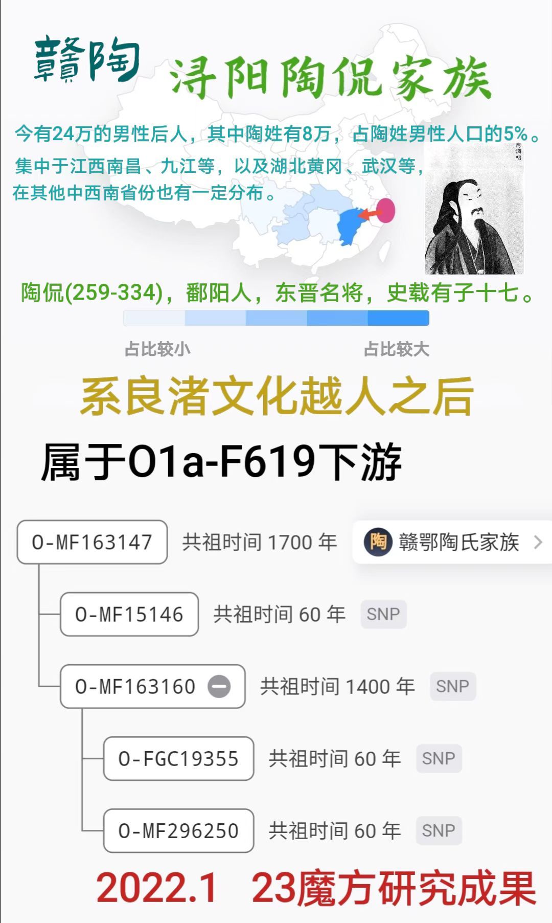 四川成都23魔方祖源数据库男性样本有24万多人(2024年),其中陶姓有574人。O1δ-F619(不含下游,包括深度检测)陶姓有16人,占陶姓样本的3%,系先越大族,对应越国越王先祖一系。O1δ-F619下游的MF163147,据23魔方父系祖源深度检测是寻阳陶侃家族的父系类型,其中南昌新建区、武汉新洲区陶姓二人较近,约共祖于1020年前;然后与宜丰陶姓三人约共祖于1490年前;最后与长沙岳麓区陶姓一人约共祖于1880年前。未做父系祖源深度检测的O1δ-F619(不含下游)陶姓尚有江西庐山、永修、瑞昌、进贤,湖北新洲,湖南靖州,四川成都,重庆渝北、大足、酉阳,大部分应为陶侃家族后人。