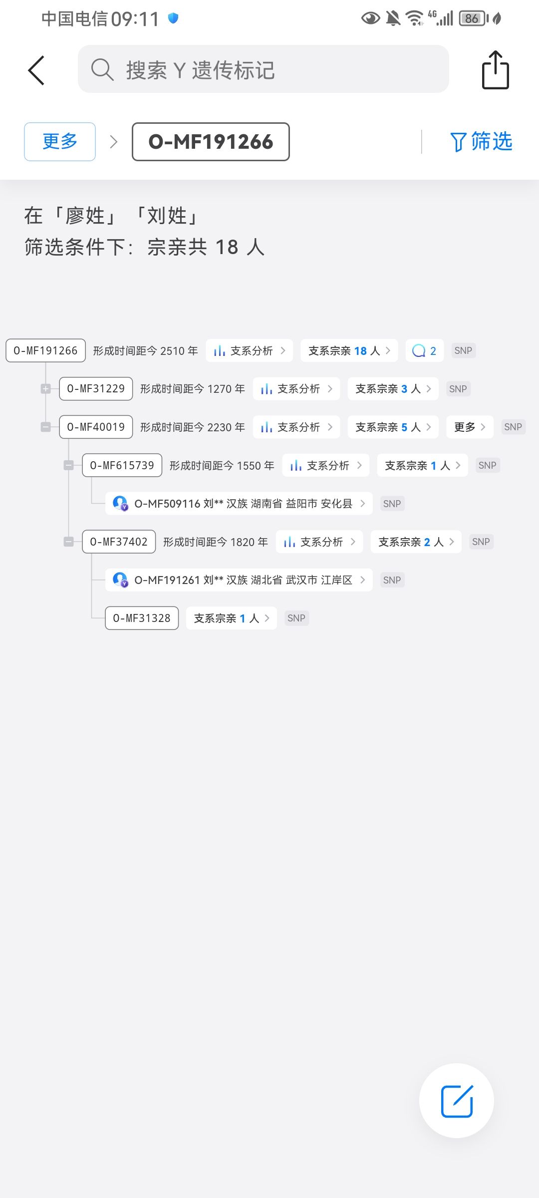 因为我在看191266有廖改刘的历史迹象,如果最后没有31328这一个姓廖的,那可以判断大概率是40019的一个改姓了刘,改姓刘的40019下游的615739和37402就都是姓刘了,结果37402下游的31328又冒出一个姓廖的。我想说O-MF615739是不是算到O-MF37402下游更合理,会不会分析的时候出现失误。