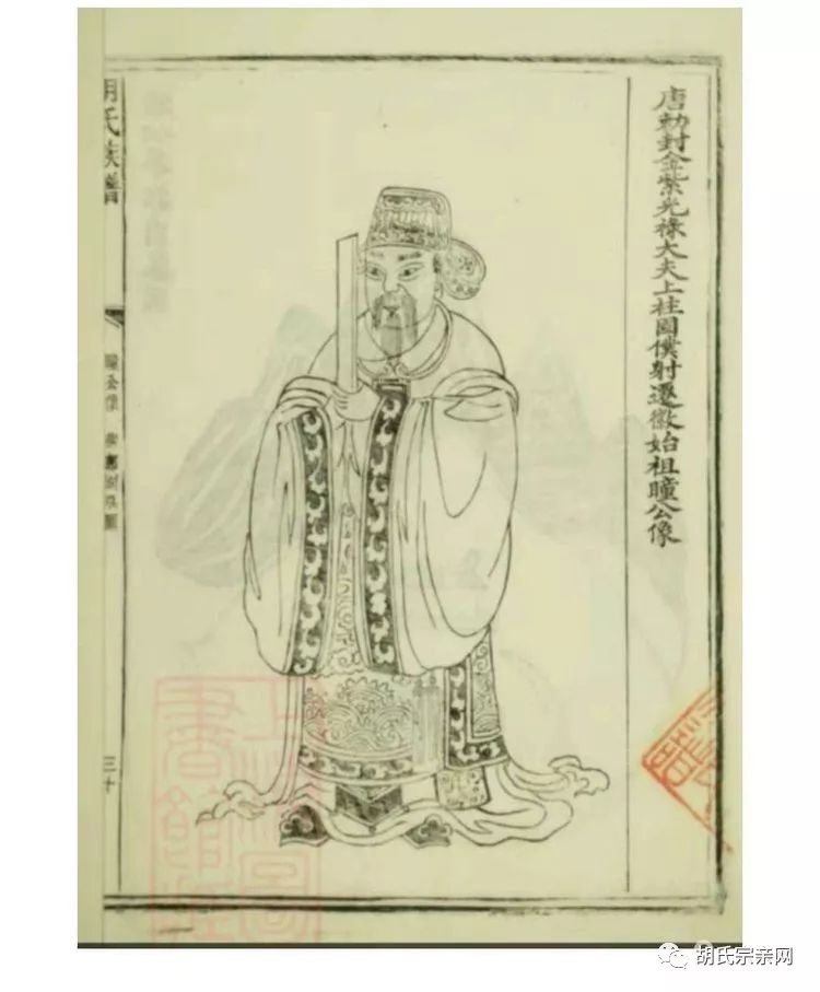 宋孝宗隆兴二年(公元1164年)六公文(字延辉,礼部尚书)之七世孙胡詧,字审言。八三助教官,鄂州军府安抚制置司府助教兼管营田劝农桑兵马事。拜常侍祠,求得常侍公胡学之遗像,并录李俊卿撰京师通泰寺碑记,乃知学公出处、征伐详情,以归,纪实成文。