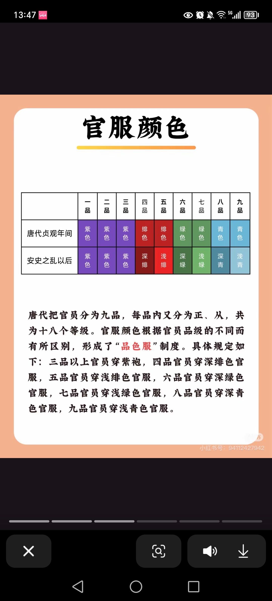 贞观四年又制,三品已上服紫,五品 已下服绯,六品、七品服绿,八品、九品服以青,带以鍮。