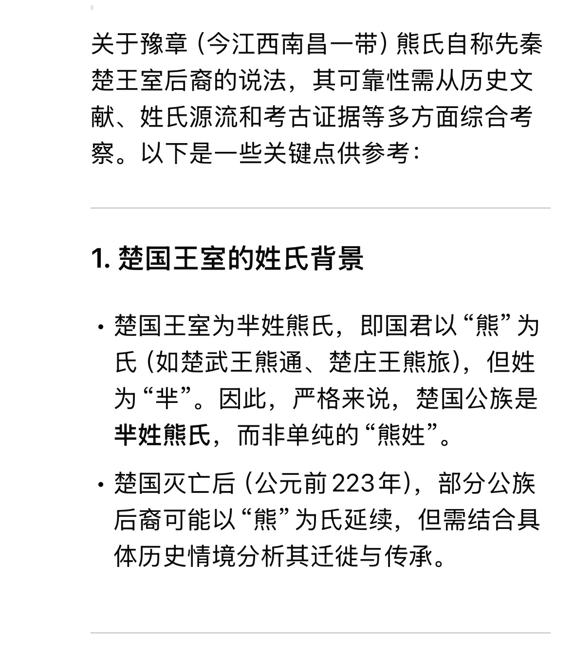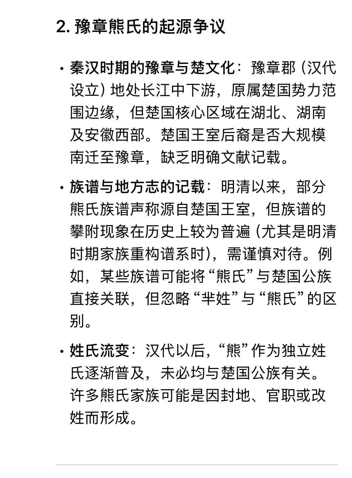 - 历史学界对楚国公族后裔的研究多聚焦于湖北、湖南及江淮地区,对豫章熊氏的讨论较少,侧面反映其说法的可信度尚未被主流学术认可。