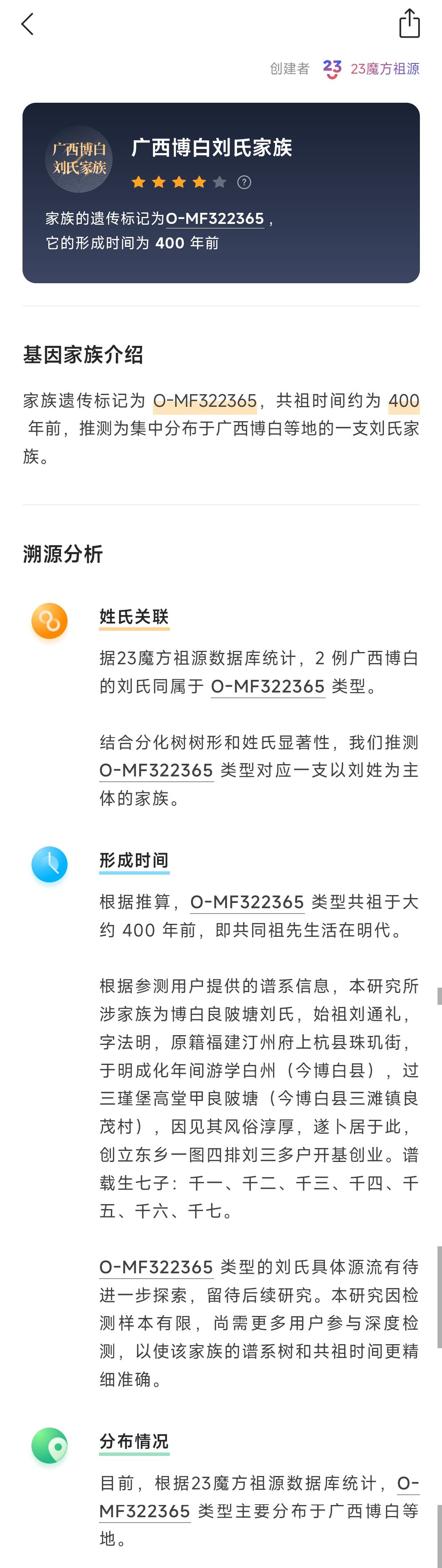 举报该帖子 终于初步验证家族#广西玉林博白刘氏👇🏻02-17· 1898 浏览1 评论️ ⛰️ 关联 3 个家族客家大县广西玉林博白刘氏刘通礼公支字辈:千大嘉继孔舜元汉世绍祖德 文明景运 治盛时雍 光承天禄 绪缵尧封 贻谋垂百代 宏谟启后昆 勤俭尊家训 修齐致太平湘桂刘氏家族广西博白刘氏家族关联 3 个单倍群O-MF16896O-MF225672O-MF322365 1 条评论 热门最新古D 古DNA3 02-17能联系到刘永福后人吗?如果他需要,我这边可以赞助添加评论1 赞 举报该评论 举报该评论 举报类型 违法违规 色情低俗 时政不实信息 引导站外加群 冒充他人 谩骂攻击 网络暴力 其他 无数据 举报描述 举报截图 提交取消评论 图片关联家族你保存和创建的家族 完成关联单倍群 完成提交评论