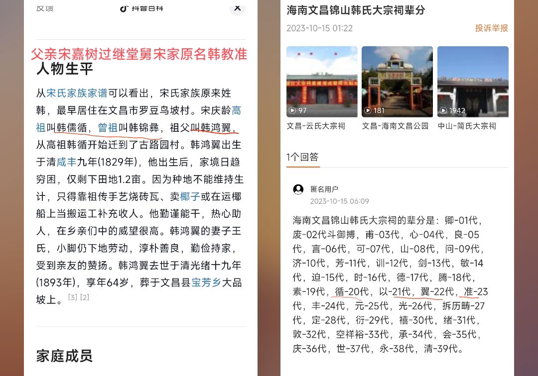 宋嘉树原姓韩,因家贫过继给他的堂舅(二婶的弟弟)《韩氏三千年——各宗支世系脉络暨人物》一致认为,宋耀如确实过继给了堂舅,后者书中言:“宋耀如,原姓韩,派名教准,琦公二十八世孙,文昌市昌洒镇古路园村人。1861年生于故乡。因过继给宋姓舅父而改姓宋。后更名嘉树,字耀如。”