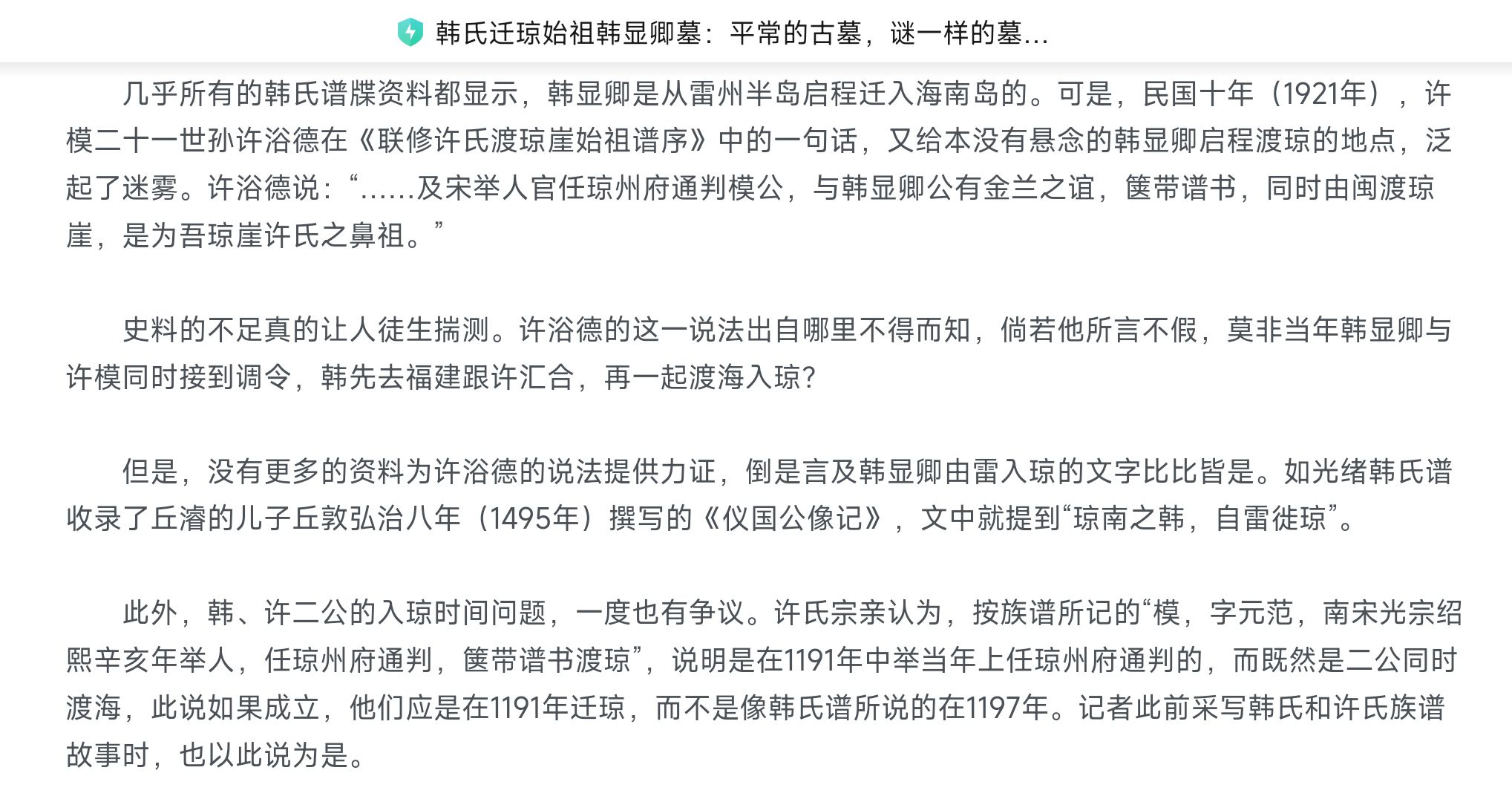 几乎所有的韩氏谱牒资料都显示,韩显卿是从雷州半岛启程迁入海南岛的。可是,民国十年(1921年),许模二十一世孙许浴德在《联修许氏渡琼崖始祖谱序》中的一句话,又给本没有悬念的韩显卿启程渡琼的地点,泛起了迷雾。许浴德说:“……及宋举人官任琼州府通判模公,与韩显卿公有金兰之谊,箧带谱书,同时由闽渡琼崖,是为吾琼崖许氏之鼻祖。”
