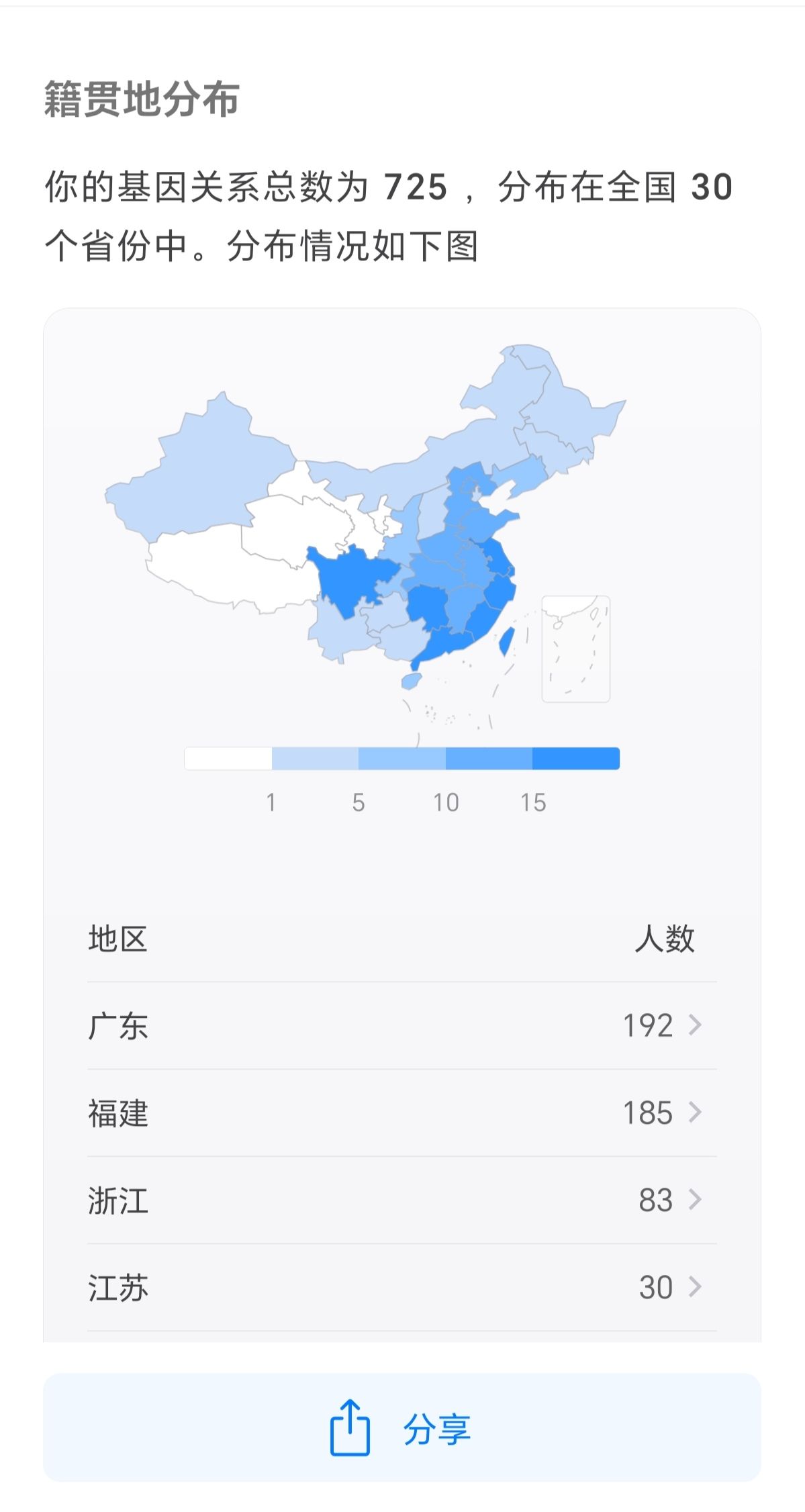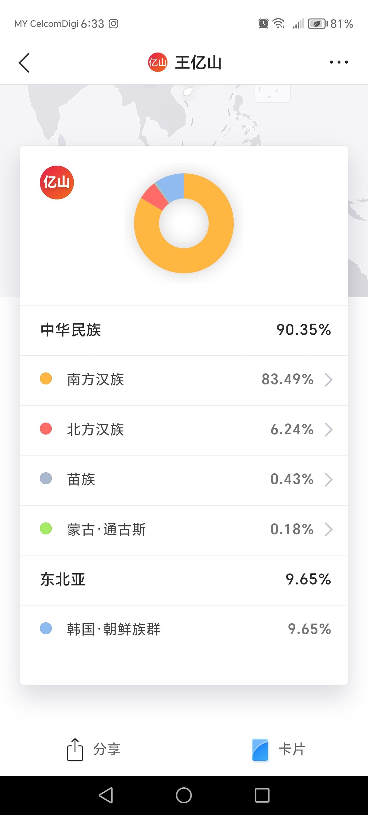 基于对家族历史,种族感兴趣。趁着3月多到中国游玩,网上预约测了个基础祖源版。今天报告出来了发现我居然有9%朝鲜血统。剩下的是南汉跟北汉,看来我是福建当地的土著 ,基因序号 O-Y149257 越国大族 。 也找到了几个 5代之前的远房表亲发现都不一样姓,共祖年代都是150-300年前 清中晚期。亲戚们分布在福建广东一代。 怀疑祖上被抱养的机率很大。