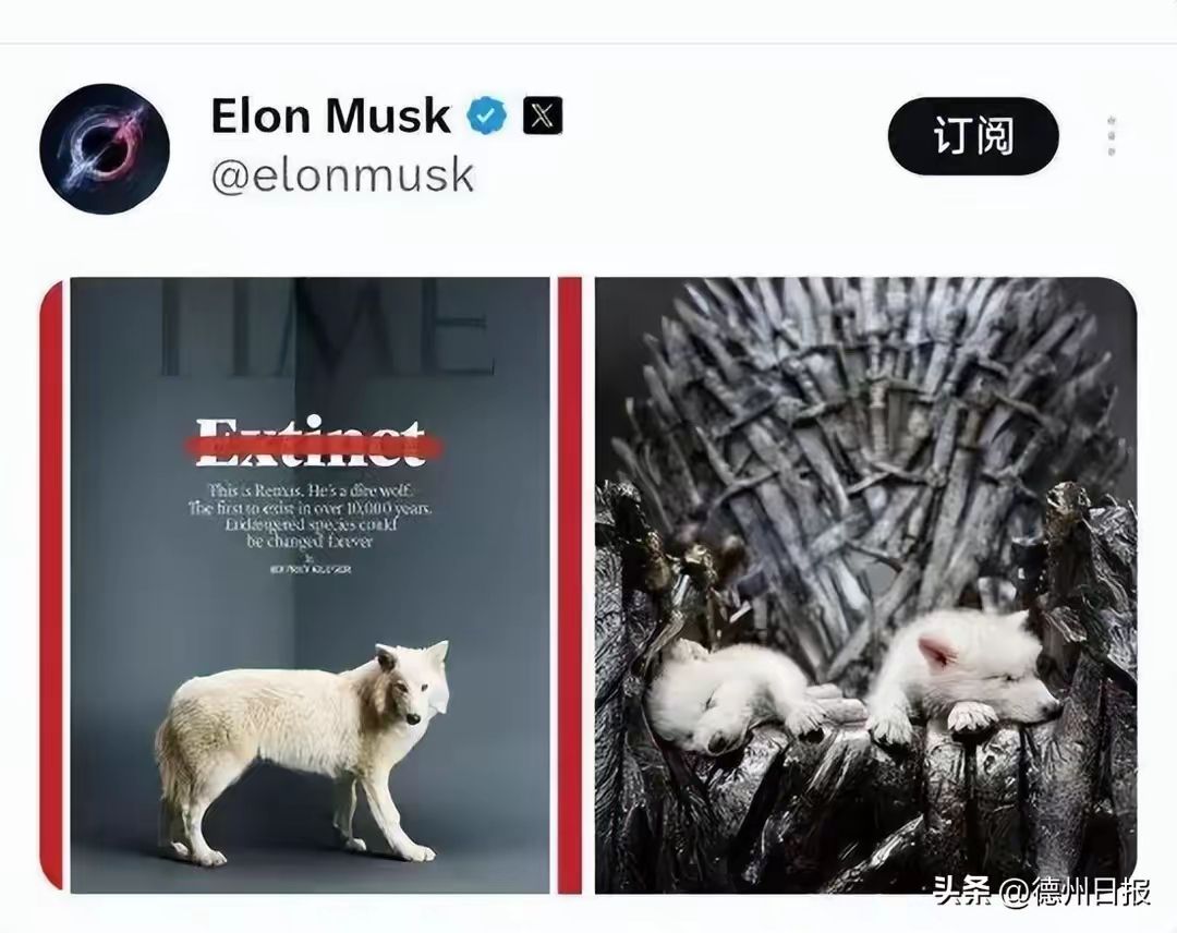 4月8日,马斯克也在其所执掌的社交媒体X上转发了《时代》杂志关于此事的封面报道照片,表达了对这一科技突破的关注。Colossal Biosciences第二大股东是马斯克旗下脑机接口公司的离岸基金,公司的生物复活项目获得特斯拉超级计算机算力支持,2024年申请的 “古生物基因商业开发” 专利技术核心依赖马斯克投资的量子计算平台,法律顾问也来自马斯克收购推特时的律师团队。