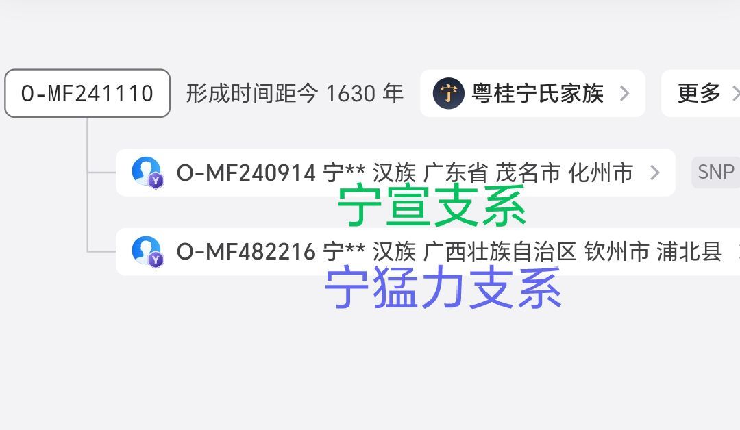因为谱记中在广东发展主要是宁宣支系后人,宁猛力后人的比较少,因此宁猛力家族基因标记更可能属于O-MF482216。
