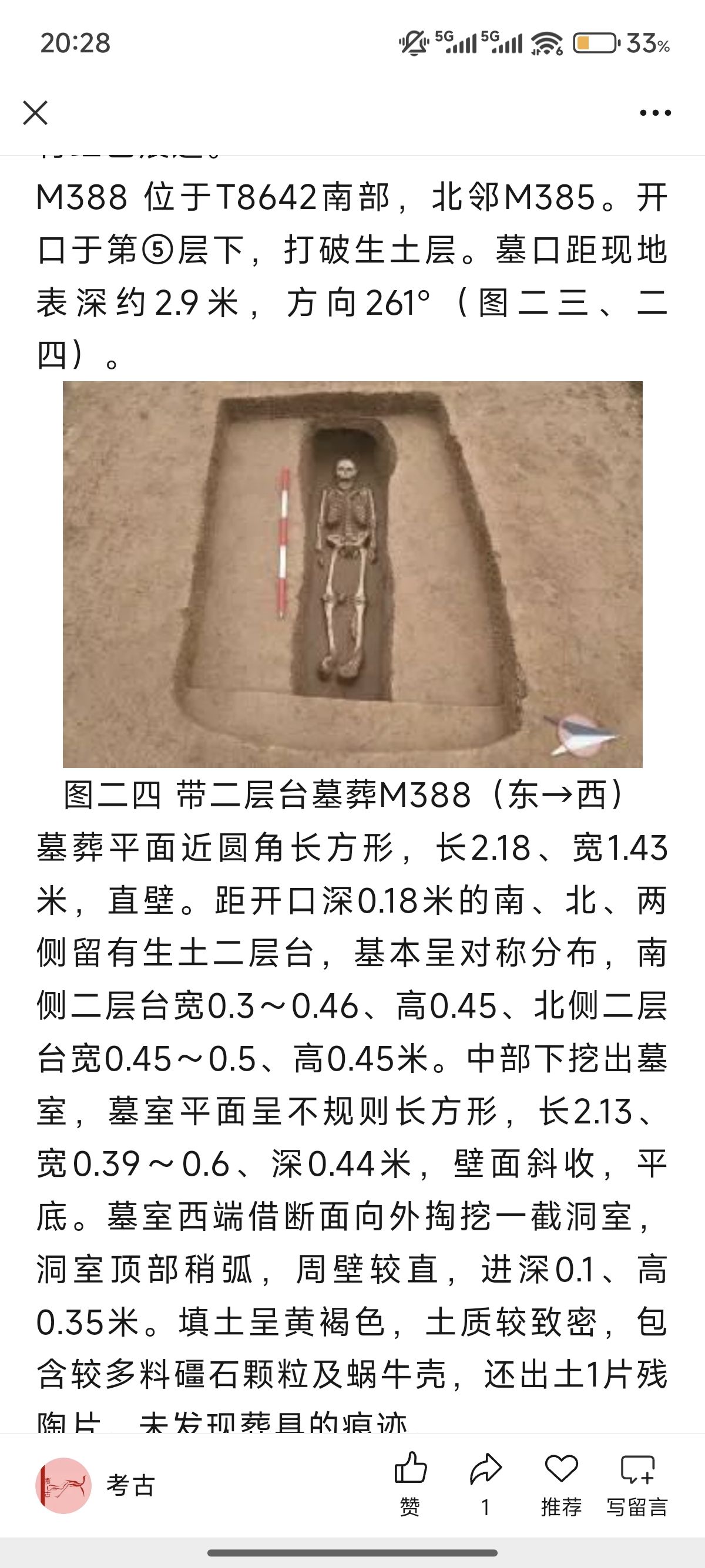 根据《陕西高陵杨官寨遗址庙底沟文化墓地发掘简报》(https://mp.weixin.qq.com/s/7RhwGjifce1ayl0q7cAcbA),M388为带二层台的竖穴土坑墓,不同于该遗址占多数的偏洞穴墓。