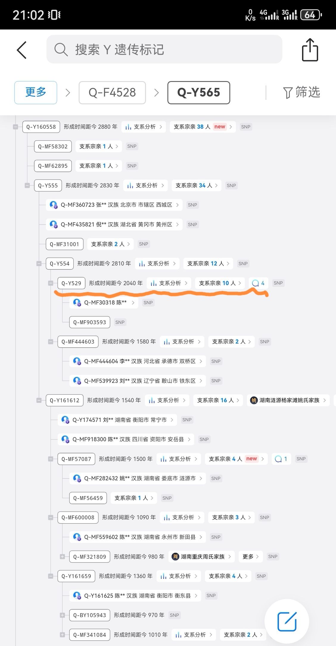 Y554分化为MF444063和Y529两支,其中MF444603下辽宁和河北各1人;Y529早期芯片样本包括山东、河北、河南共4人,近两年全基因和个人检测4共检测到4人,其中湖南2人、四川1人(与湖南1人同姓,大概率是湖广填川的移民)、香港1人。 另外,Y554的4支兄弟支系,2支仍在北方,1支为单个湖北样本,1支Y161612为典型的湖南支系。