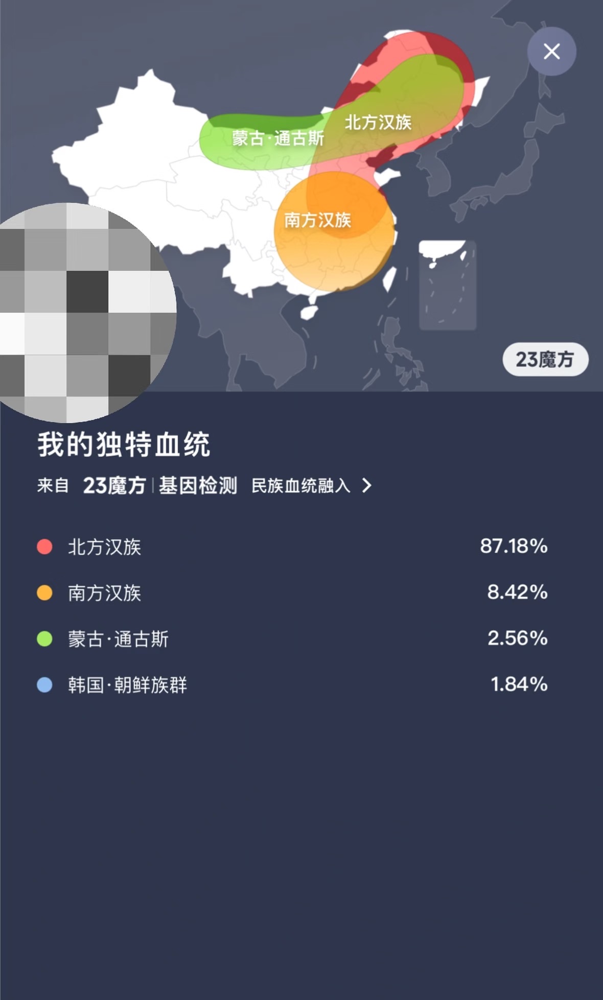 啥也解释不了,这只能判断你是东北人的几率大,把亲缘关系发出来看看,Y基因发不来看看综合可大致判断下