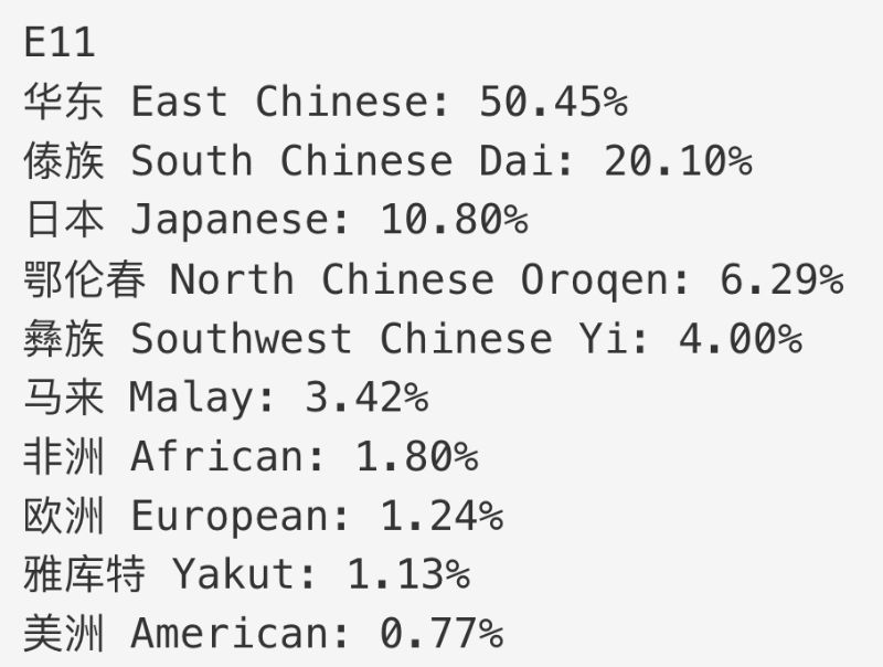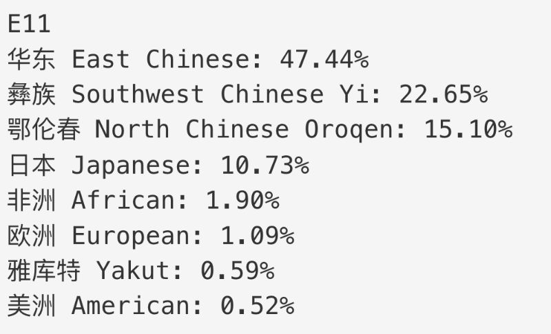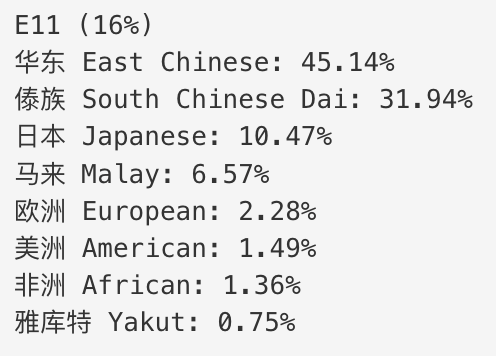 从E11数据来看,三里河的傣成分远高于其他山东大汶口文化的样本,代表北方的鄂伦春和西部的彝也低于其他大汶口样本。除了O-F325下游的三里河古人之外,其他七个三里河样本的常染数据也有一样的规律。(包括两个N-CTS582的下游和五个女人)这代表三里河的O-F325古人并不是一个近代搬移此地的外来者,他的常染反而早就已经本地化了。