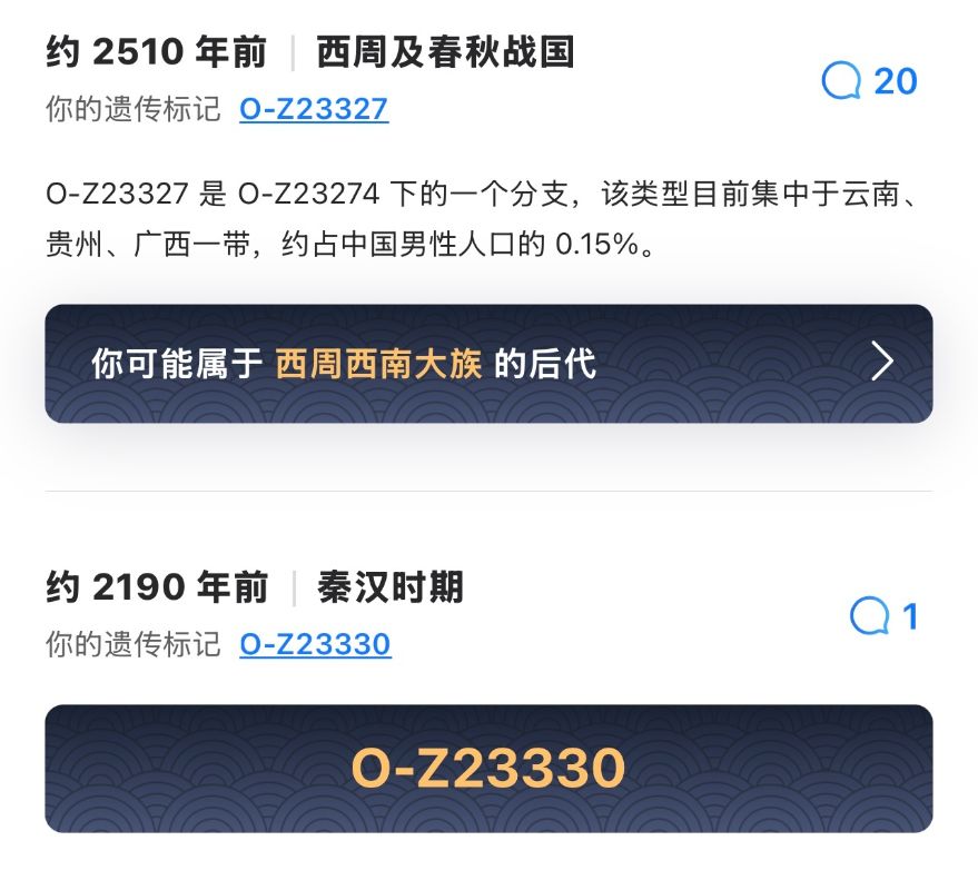 举报该帖子 秦汉时期古滇国核心贵族01-01· 896 浏览6 评论 。。。 如题所示。树形基本明确为西汉云南支系。后代分布算上上游没有下沉的集中在昆明一带,之后像四周扩散。关联 1 个单倍群O-Z23330 6 条评论 热门最新 双尾猫 01-11西南大族主要是下游这些支系造成的添加评论4 赞 举报该评论 举报该评论 举报类型 违法违规 色情低俗 时政不实信息 引导站外加群 冒充他人 谩骂攻击 网络暴力 其他 无数据 举报描述 举报截图 提交取消评论 枫 01-01很云南的支系添加评论3 赞 举报该评论 举报该评论 举报类型 违法违规 色情低俗 时政不实信息 引导站外加群 冒充他人 谩骂攻击 网络暴力 其他 无数据 举报描述 举报截图 提交取消评论 用户0279_gpxOw 01-11古滇平民添加评论2 赞 举报该评论 举报该评论 举报类型 违法违规 色情低俗 时政不实信息 引导站外加群 冒充他人 谩骂攻击 网络暴力 其他 无数据 举报描述 举报截图 提交取消评论百6 百666 01-02这支分布很广!东南亚人口也很多。1 评论1 赞 举报该评论 举报该评论 举报类型 违法违规 色情低俗 时政不实信息 引导站外加群 冒充他人 谩骂攻击 网络暴力 其他 无数据 举报描述 举报截图 提交 。。。 01-02是的点赞 举报该评论 举报该评论 举报类型 违法违规 色情低俗 时政不实信息 引导站外加群 冒充他人 谩骂攻击 网络暴力 其他 无数据 举报描述 举报截图 提交取消评论取消评论 陈 01-13滇王20932支添加评论点赞 举报该评论 举报该评论 举报类型 违法违规 色情低俗 时政不实信息 引导站外加群 冒充他人 谩骂攻击 网络暴力 其他 无数据 举报描述 举报截图 提交取消评论 图片关联家族你保存和创建的家族 完成关联单倍群 完成提交评论