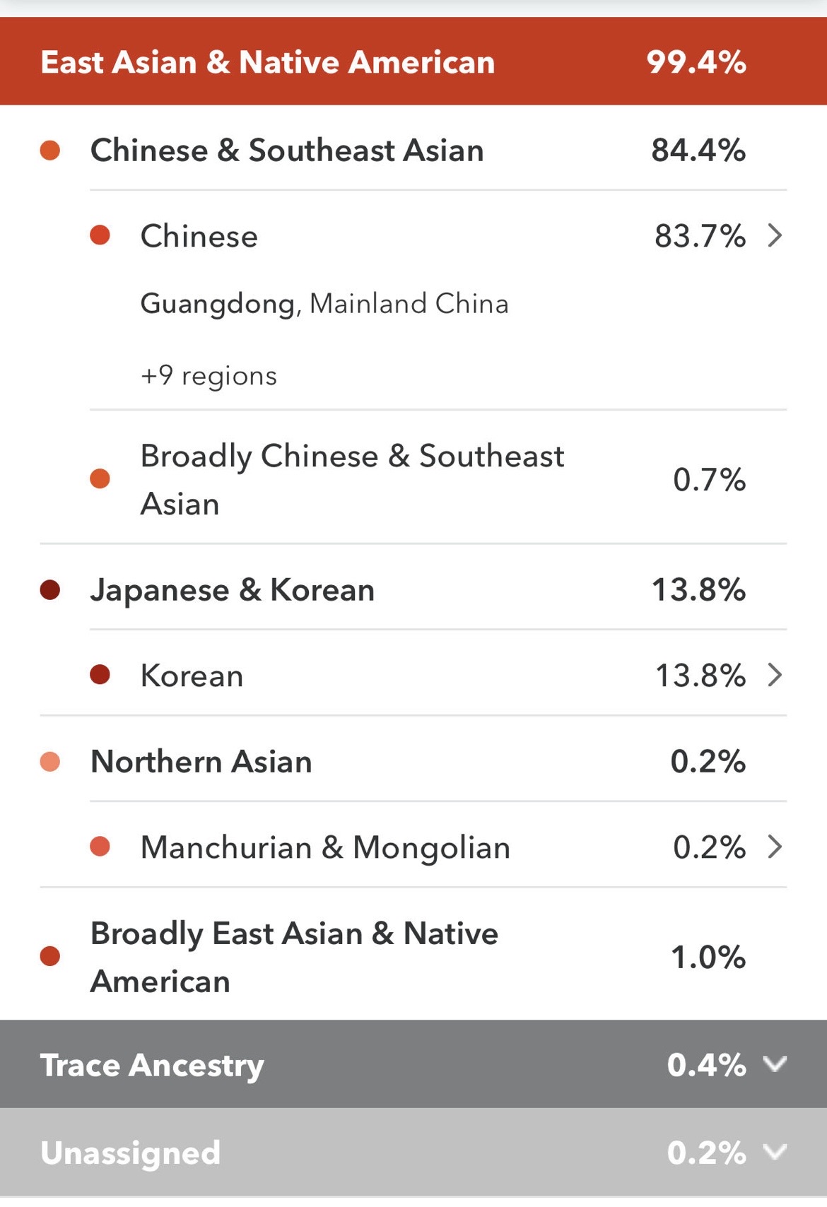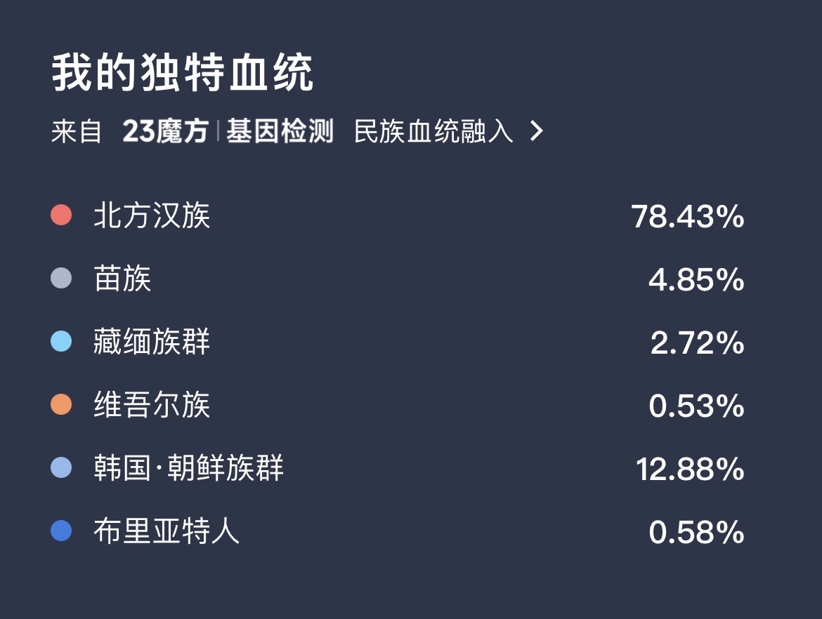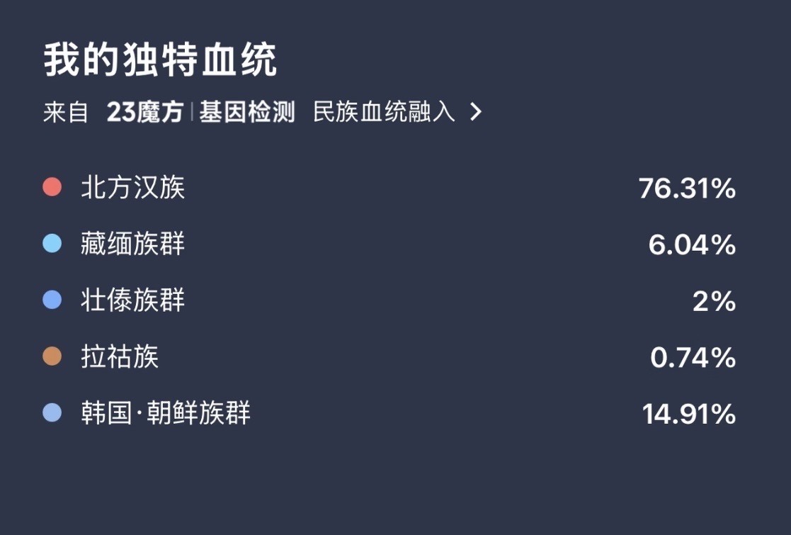之前我发过帖子,以23魔方和illustrativeDNA两个平台的常染结果为依据,发现我有13%左右稳定的类朝韩常染,结果如下: