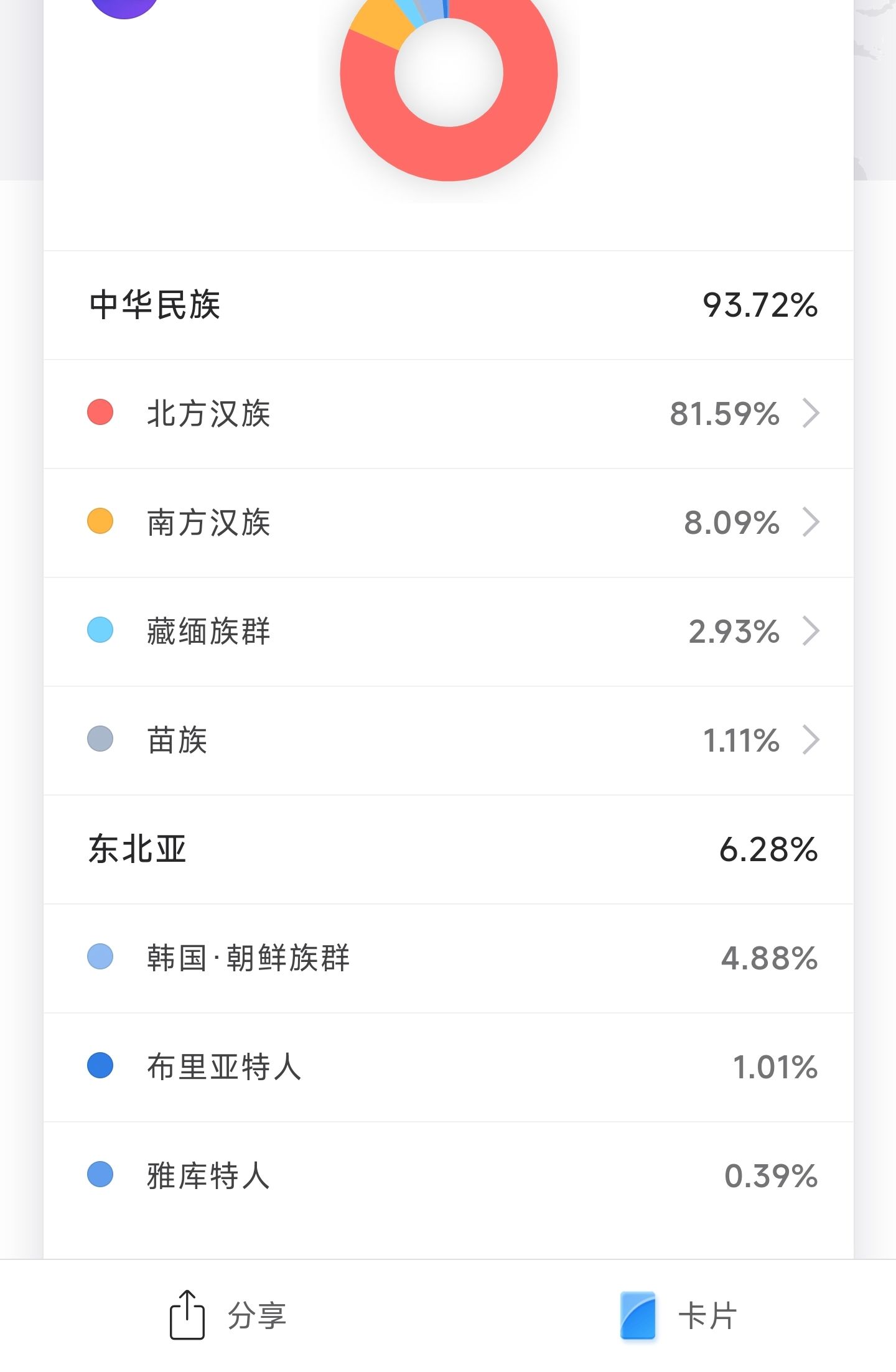 举报该帖子 求分析02-16· 409 浏览3 评论 rs 山东人,没想到有百分之六的东北亚,这正常吗。 3 条评论 热门最新 用户1963_7NjU6 02-17这是线粒体基因,如果你再追溯上去与猴子以及所有生物都是一个祖先。现在传统祖源是父系,你现在要追寻的是几百年前的父系祖宗。添加评论点赞 举报该评论 举报该评论 举报类型 违法违规 色情低俗 时政不实信息 引导站外加群 冒充他人 谩骂攻击 网络暴力 其他 无数据 举报描述 举报截图 提交取消评论 木子 02-16正常,你们本来就有同祖源添加评论点赞 举报该评论 举报该评论 举报类型 违法违规 色情低俗 时政不实信息 引导站外加群 冒充他人 谩骂攻击 网络暴力 其他 无数据 举报描述 举报截图 提交取消评论 使徒 02-16添加评论点赞 举报该评论 举报该评论 举报类型 违法违规 色情低俗 时政不实信息 引导站外加群 冒充他人 谩骂攻击 网络暴力 其他 无数据 举报描述 举报截图 提交取消评论 图片关联家族你保存和创建的家族 完成关联单倍群 完成提交评论