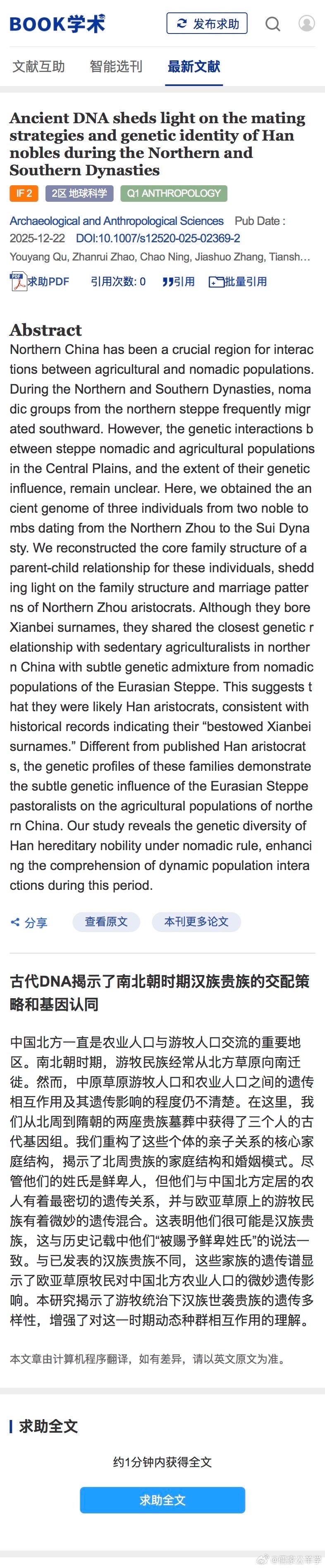 国际权威学术期刊《考古学与人类学科学Archaeological and Anthropological Sciences》2025年12月22日公布李唐皇室先世北周大野氏古dna数据,大野氏为典型西北汉族,并非鲜卑人!