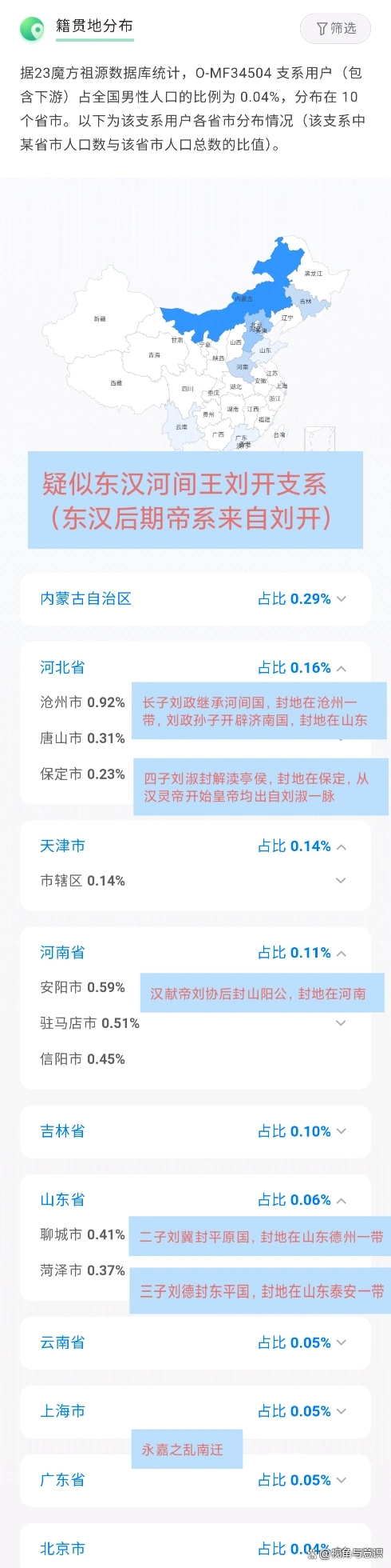 河间王刘开事实上是汉章帝之后的东汉嫡系,因为东汉自第4代皇帝汉和帝刘肇之后,皇帝普遍短命,后过继刘开之后继承帝统,而刘开生16子,除封王封侯外,后续子孙又开辟了不少封国。O-MF34504目前开出了5个分支,后续新增的潜力较大。O-MF34504在分布上和东汉河间王封地匹配度极高,以河间国所在的沧州最为高频,达到1%左右,在刘开儿子封国所在的鲁北、鲁西、保定等地区均有分布;在江南等地区也有不少分布,可能在永嘉之乱的时候,还是权贵,所以有资格随同曹氏陈留王族等人一起南迁,估计是山阳公比较亲近的支系。