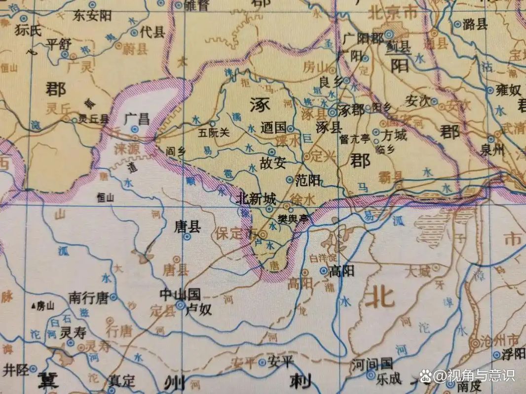 中山国在保定的西南部,都城卢奴在今保定最南端的定州。而涿郡在保定的东北部,及与今涿州交界的北京房山、大兴、河北廊坊等部分地区。如图: