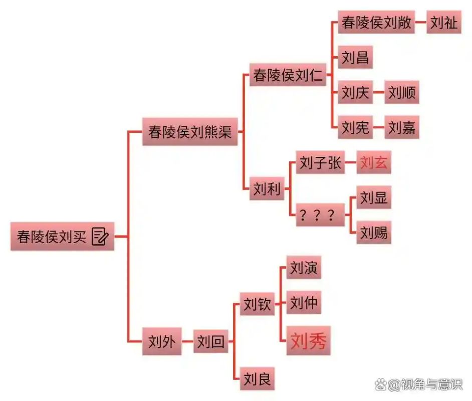 如果O-MF6722是刘秀,说明东汉皇帝已经换了,汉朝被王莽灭国之后,没有真正的恢复。那为什么刘邦家族还能在东汉时期人口大爆发呢?刘邦家族下游的O-Y20928,与O-MF6722几乎同时爆发,规模比O-MF6722略小,但也非常庞大,地域分布上两者都差不多,可以看出O-Y20928也是汉代中后期强势崛起的家族。这是因为刘秀称帝是打着“光复汉室”的旗号进行的,利用了汉室的声望和势力,所以打下江山之后,不但没有清洗原先的西汉宗室,反而大肆册封为王侯。根据记载,刘秀新封了137名原西汉宗室,其中绝大部分是舂陵侯嫡系一脉,由于刘秀族谱上是舂陵侯旁系,他是按血脉远近来册封的,最亲近的舂陵侯嫡系全族受封于中原,当时封到了第6代,人数估计已有近百人。也就是东汉宗室其实是分成了2大支的,一支是光武帝刘秀一族,另一支是更始帝刘玄一族,这2支是真正的东汉宗室,造反免诛的。下面是东汉宗室主要支系族谱图: