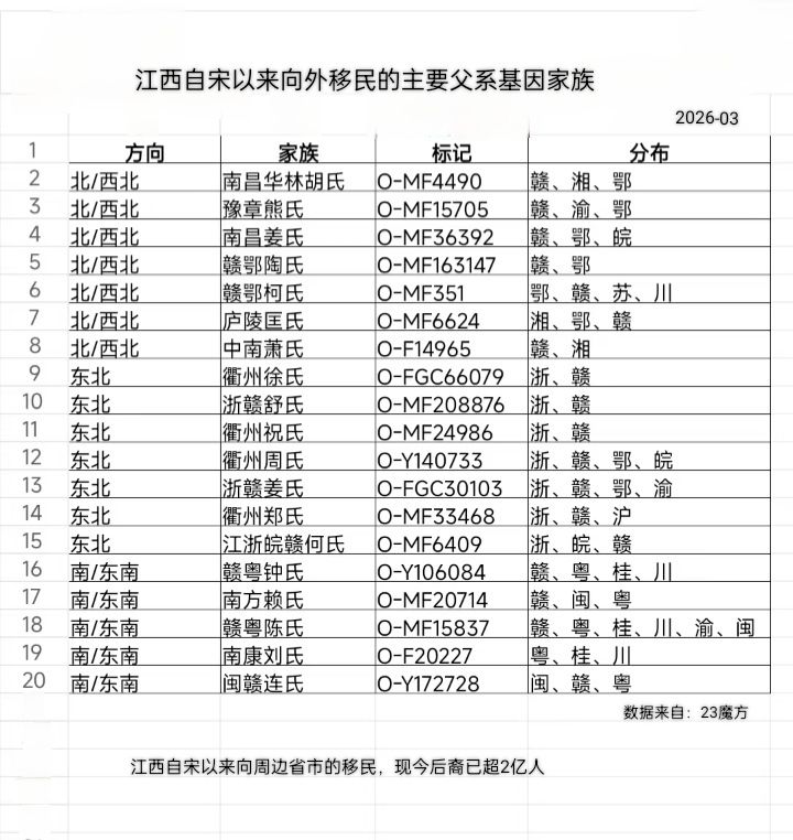 举报该帖子 江西填湖广湖广填川,Y染DNA与文化叙事的完美互证03-06· 377 浏览6 评论 觉有情 江西自宋特别是靖康南渡的一千年以来,向周边省市多次的移民输出,成就了名符其实的”江西老表"。许多宗族的源流记载:来自江西。现代随着科学技术的高速发展,特别是近年来人类分子生物学也取得长足发展。通过基因检测来寻根溯源认识自我好奇乐趣的人也越来越多,在魔方数据库中,通过大量数据和父系基因家族的研究,江西省向周边省市的历史以来的多次移民,在文化与基因上得到了完美的互证。 6 条评论 热门最新ZM zmjjkk 前天 04:26nb,衢州徐也变成江西往外移民的了1 评论1 赞 举报该评论 举报该评论 举报类型 违法违规 色情低俗 时政不实信息 引导站外加群 冒充他人 谩骂攻击 网络暴力 其他 无数据 举报描述 举报截图 提交 觉有情 前天 04:44应该是移来移去点赞 举报该评论 举报该评论 举报类型 违法违规 色情低俗 时政不实信息 引导站外加群 冒充他人 谩骂攻击 网络暴力 其他 无数据 举报描述 举报截图 提交取消评论取消评论 无鬼斋 03-06结果移民湖南的并不多😂记得好多湖南家族都记载来自江西1 评论1 赞 举报该评论 举报该评论 举报类型 违法违规 色情低俗 时政不实信息 引导站外加群 冒充他人 谩骂攻击 网络暴力 其他 无数据 举报描述 举报截图 提交 英布之剑 前天 06:36江西填湖广点赞 举报该评论 举报该评论 举报类型 违法违规 色情低俗 时政不实信息 引导站外加群 冒充他人 谩骂攻击 网络暴力 其他 无数据 举报描述 举报截图 提交取消评论取消评论 吴庆和(爷爷给取的名字) 03-06江西土著还真是以越人为主吗?1 评论点赞 举报该评论 举报该评论 举报类型 违法违规 色情低俗 时政不实信息 引导站外加群 冒充他人 谩骂攻击 网络暴力 其他 无数据 举报描述 举报截图 提交人士 江湖人士 03-06父系母系(父系)都是F325下江西近两千年土著点赞 举报该评论 举报该评论 举报类型 违法违规 色情低俗 时政不实信息 引导站外加群 冒充他人 谩骂攻击 网络暴力 其他 无数据 举报描述 举报截图 提交取消评论取消评论 图片关联家族你保存和创建的家族 完成关联单倍群 完成提交评论