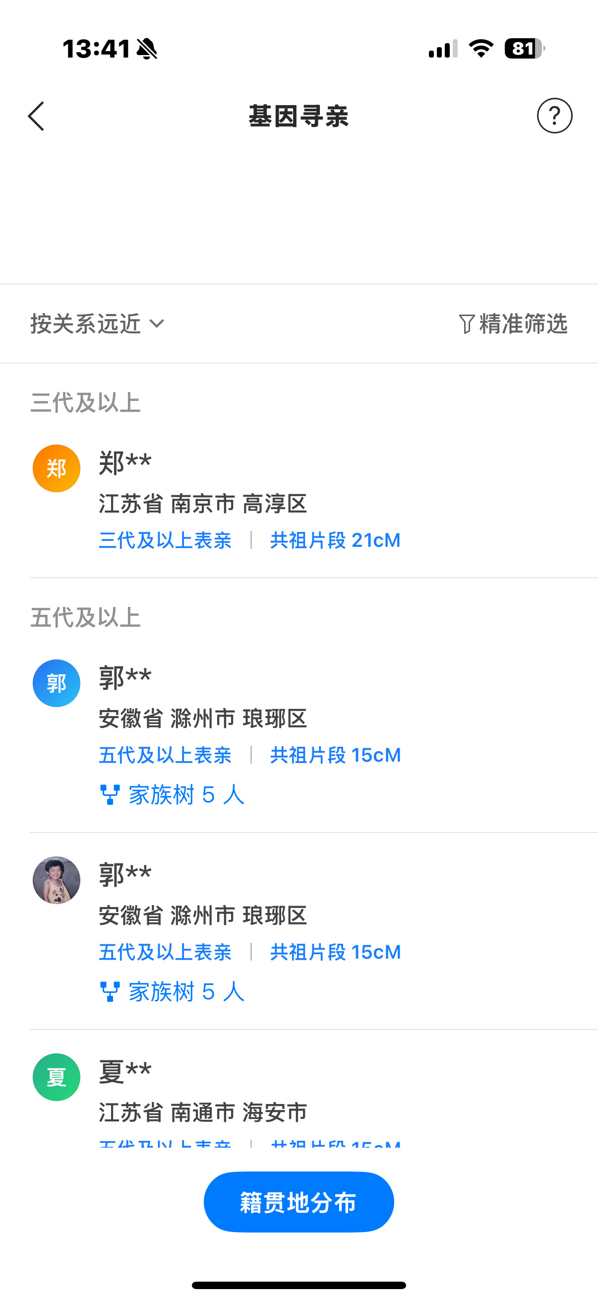 举报该帖子 哪位大佬可以帮我分析一下我是哪里人,我是寻亲🙏🙏🙏昨天 05:48· 317 浏览11 评论心心 心心 11 条评论 热门最新 阿白阿白 昨天 06:01民族成分符合浙江中北及江苏等地的情况。可以看看前面几个省下面的细分有没有地级市、县比较集中的。看cM前几位,安徽也是符合的。8 评论2 赞 举报该评论 举报该评论 举报类型 违法违规 色情低俗 时政不实信息 引导站外加群 冒充他人 谩骂攻击 网络暴力 其他 无数据 举报描述 举报截图 提交心心 心心 昨天 06:06我的23魔方数据太分散了,具体分析不出来我到底会是哪里人,唉😔,我也不知道怎么寻亲了,我是2003年在安徽马鞍山市妇幼保健医院出生,然后父母就抛下了我,在医院留下的名字是王宏宝和红花点赞 举报该评论 举报该评论 举报类型 违法违规 色情低俗 时政不实信息 引导站外加群 冒充他人 谩骂攻击 网络暴力 其他 无数据 举报描述 举报截图 提交取消评论 英布之剑 昨天 06:32@心心:寻亲,最怕的是你在这里找他们,他们在别处找你。。所以先试试抖音,可能比这里有效。。。这里可以做进一步确认。点赞 举报该评论 举报该评论 举报类型 违法违规 色情低俗 时政不实信息 引导站外加群 冒充他人 谩骂攻击 网络暴力 其他 无数据 举报描述 举报截图 提交取消评论取消评论 英布之剑 昨天 06:31抖音发布寻亲信息,定位放到马鞍山。。。这样马鞍山的人更容易看到,如果有疑似的人,再做亲子鉴定。添加评论点赞 举报该评论 举报该评论 举报类型 违法违规 色情低俗 时政不实信息 引导站外加群 冒充他人 谩骂攻击 网络暴力 其他 无数据 举报描述 举报截图 提交取消评论 阿白阿白 昨天 06:16马鞍山、滁州、南京都是符合这个民族成分比例的。大概率也就是这片区域。可以考虑求助出生地即马鞍山的媒体,也许通过媒体传播,有认识当年这两个名字的人会提供线索。添加评论点赞 举报该评论 举报该评论 举报类型 违法违规 色情低俗 时政不实信息 引导站外加群 冒充他人 谩骂攻击 网络暴力 其他 无数据 举报描述 举报截图 提交取消评论 图片关联家族你保存和创建的家族 完成关联单倍群 完成提交评论