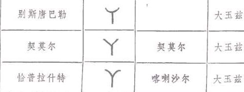 Y “月亮”或者“巴干阿勒”印记=车鼻施=契莫尔(与拔悉蜜右骁卫大金山道总管处木昆执米啜同名)=Tört Tamgaluu Azik ≈ 大玉滋 Bes Tamgaluu =乙息记 Азык可汗=阿史那科罗=珂罗啜=哈拉绰拉Kara Çoro=而车鼻施之子萨亚克和阿巴克是哥弟关系。