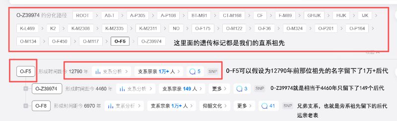 大家都知道基因突变每80年左右(可能这数字不一定准)会变一次,以我们O-F5为例子,O-F5他实际上不是一个人,他是一群人,可能是兄弟辈,可能是父亲那一辈,爷爷那一辈也有可能是儿子辈等等。实际上,你不需要相信的那么复杂,你就把他当成一个人就是了,O-F5生下来2个儿子,一个O-Z39974,还一个O-F8。为什么同样是儿子,有的人数多,有的年限差距那么大,这个不得不说多生儿子的好处了,儿子后代生儿子越多,那么时间越近,后代人数自然就多了,如果儿子生的少,生的女儿特别多,那么一脉相承的几率就更高了。我们就假设O-Z39974这位祖先他不生儿子,那么这一根支系就断开了,那么只有O-F8,也没有O-Z39974了。那么就是O-M117下游只有O-F8和O-CTS4960了。我其实更希望O-Z39974的人数越来越多(本来人数就很少),壮大我们的支系,希望测的人越来越大,互相联系的人更多。